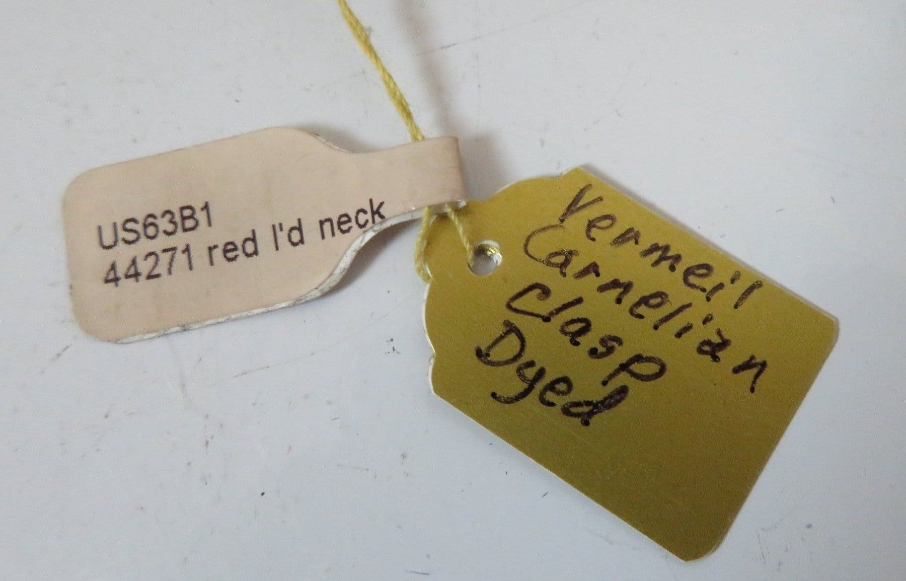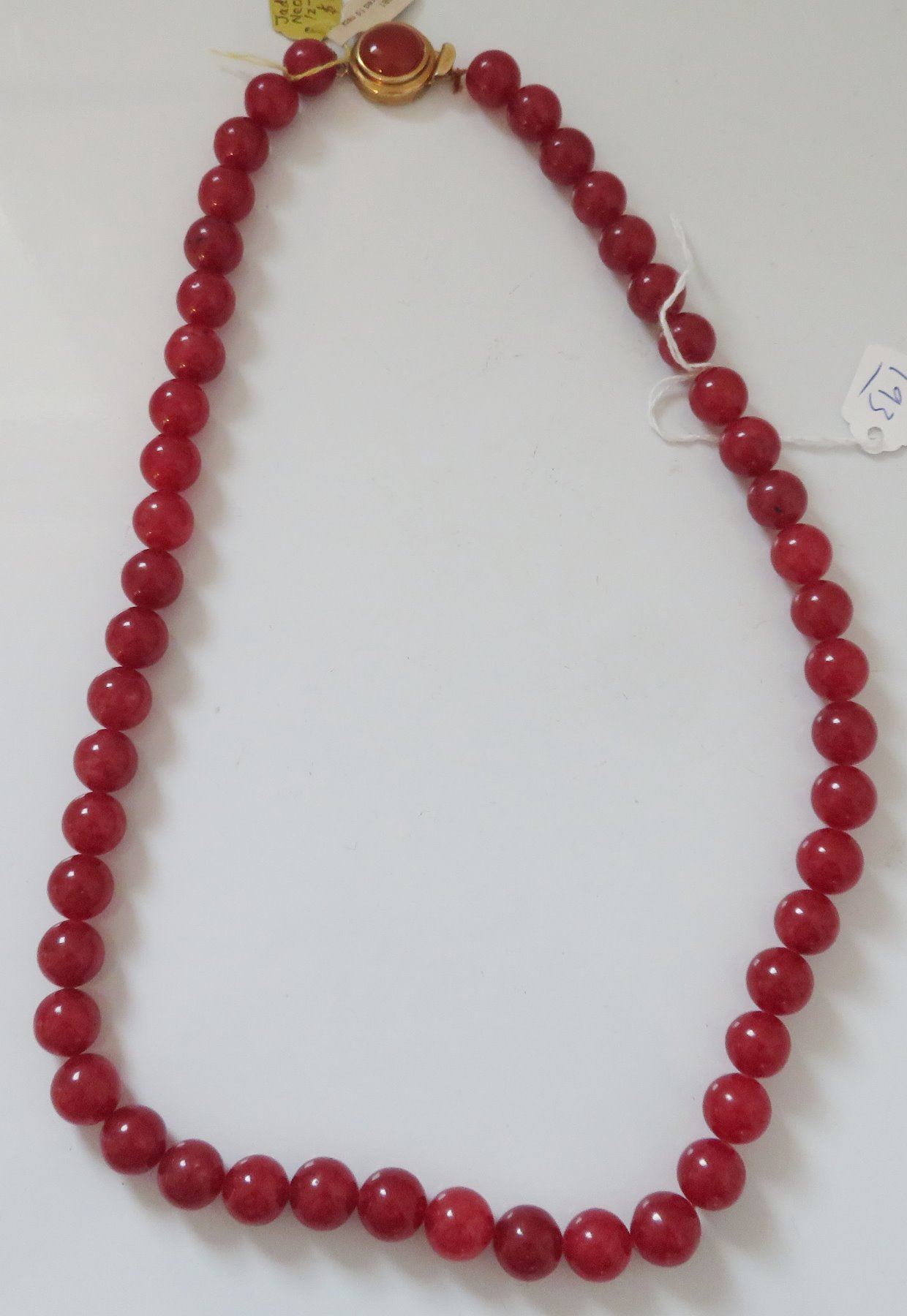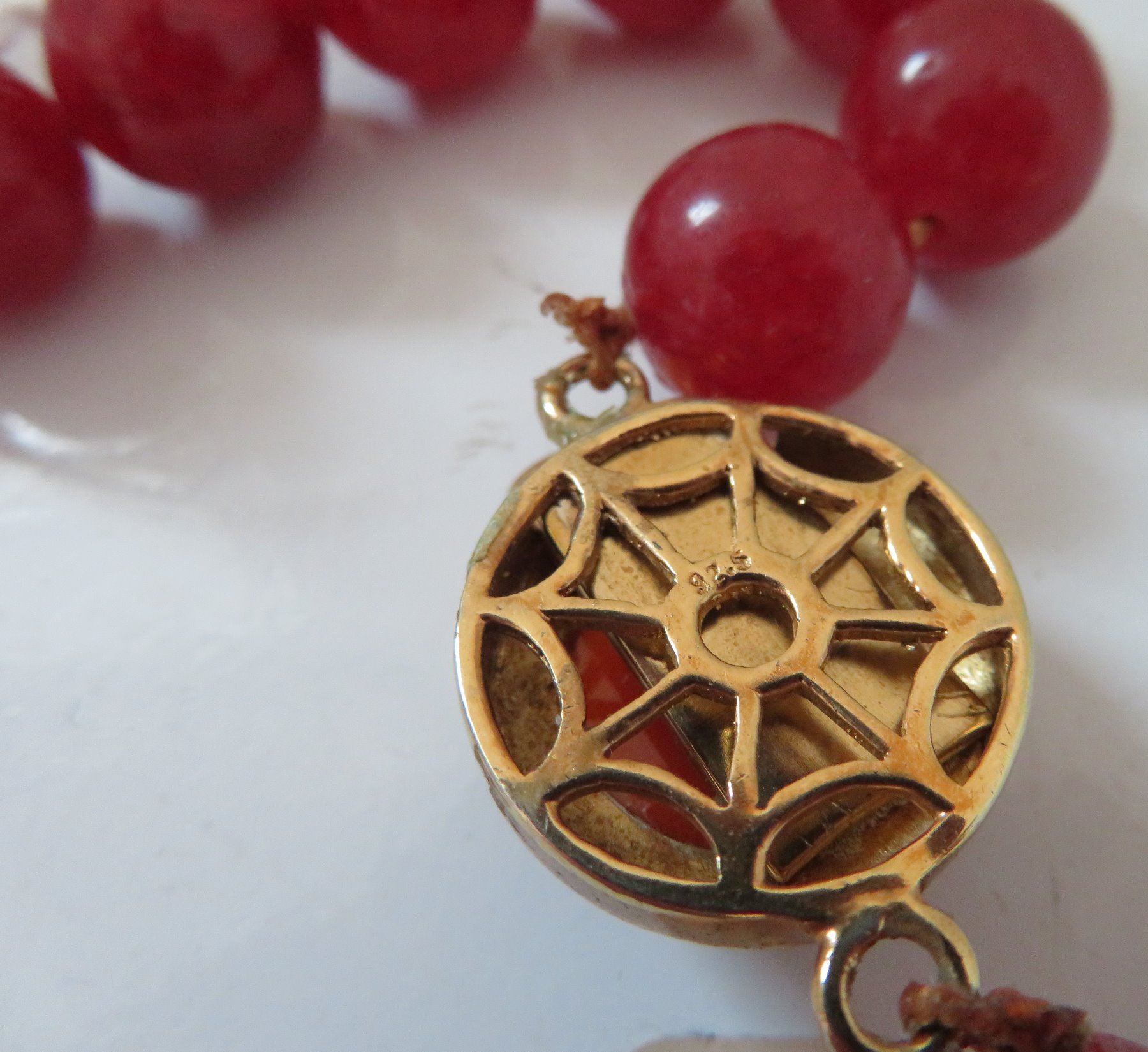 Dyed Jade Necklace w/Vermeil Carnelian Clasp, 20th century item. Made of dyed jade and carnelian, the item hangs 14" as worn. Condition: Good, see images. Shipping: $15.50 w/insurance and signature.