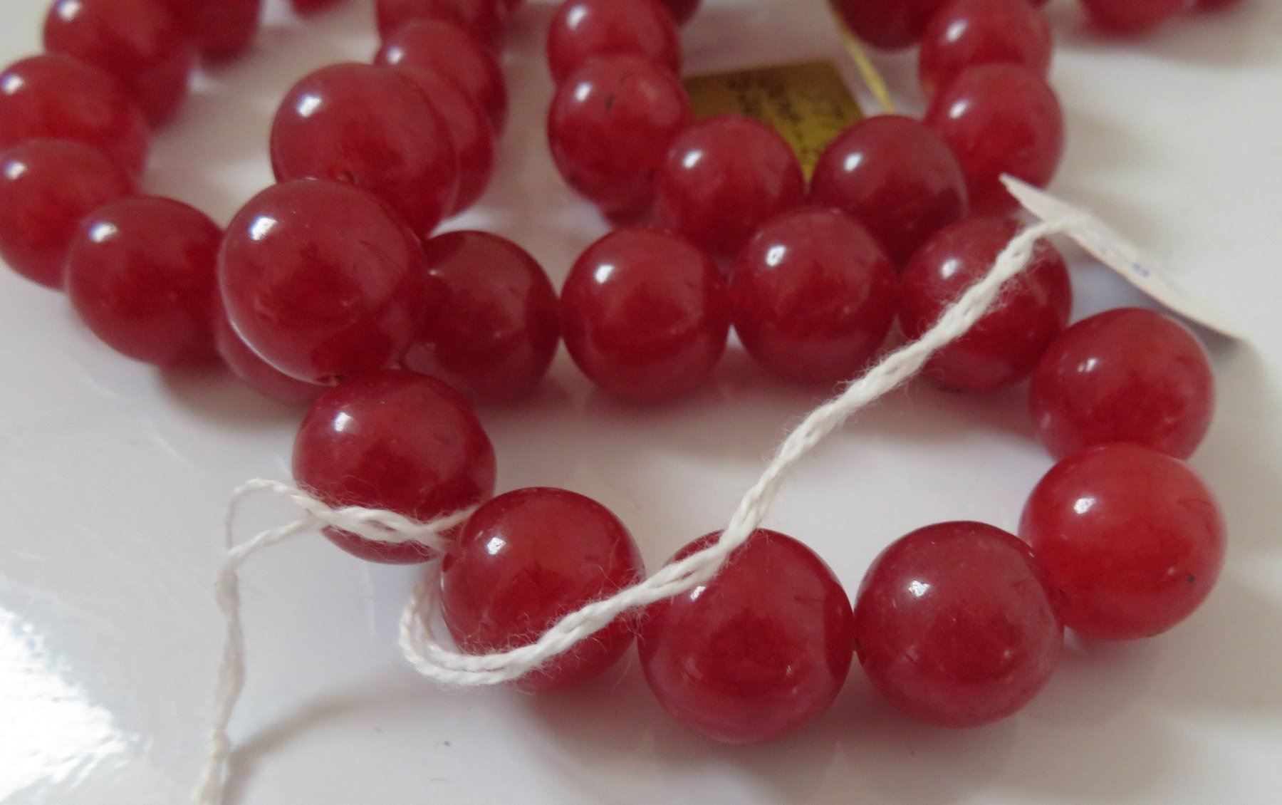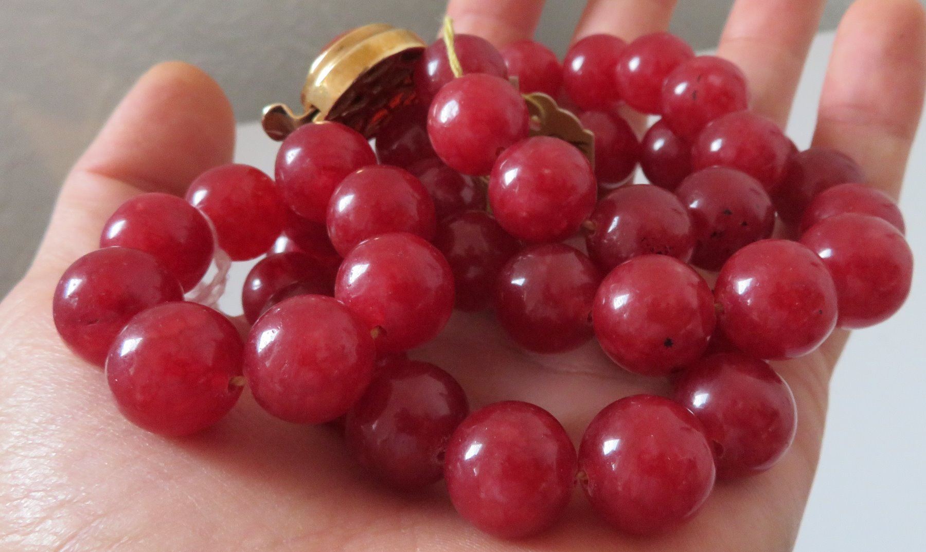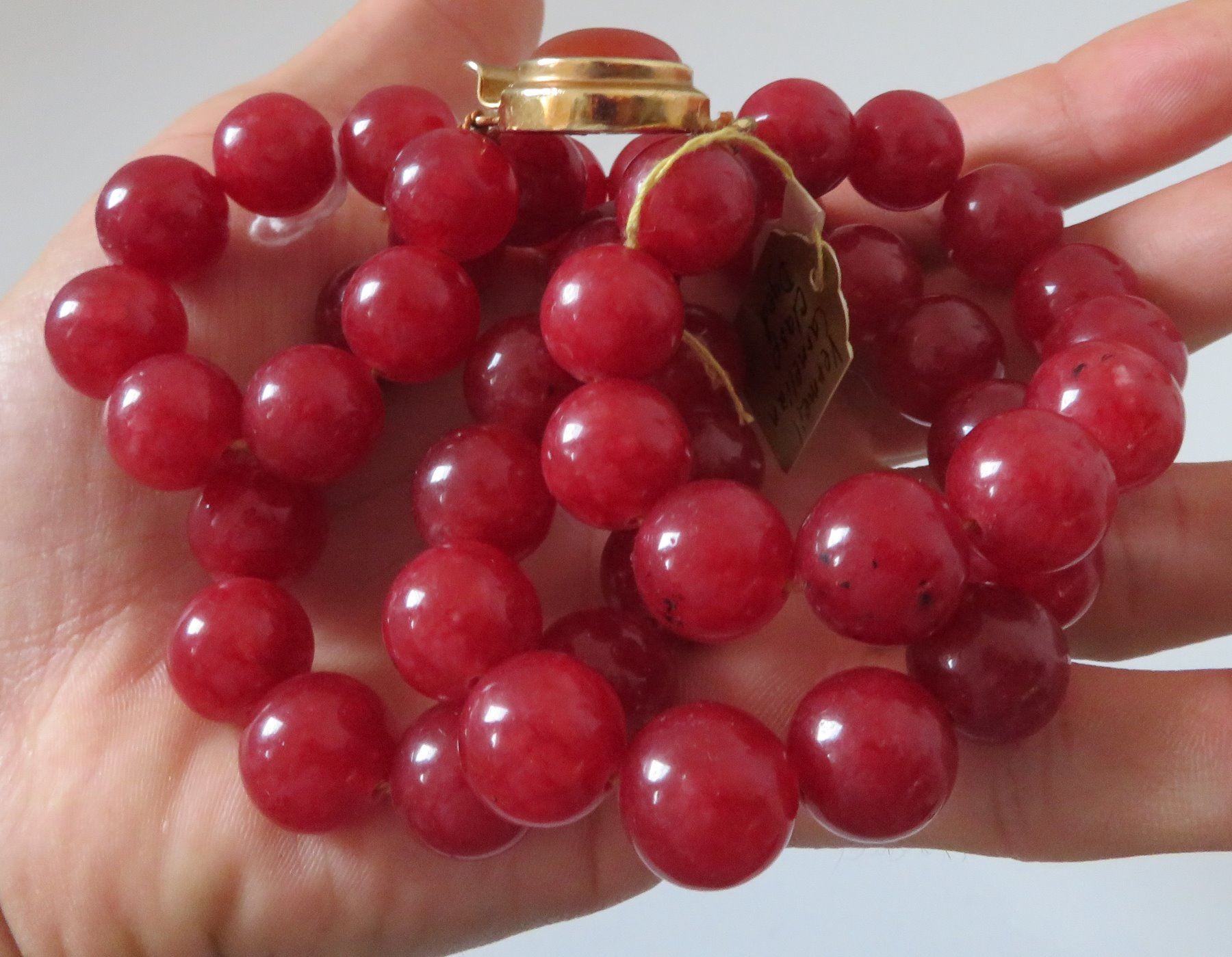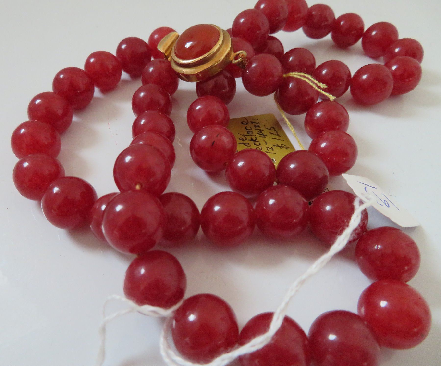 Dyed Jade Necklace w/Vermeil Carnelian Clasp, 20th century item. Made of dyed jade and carnelian, the item hangs 14" as worn. Condition: Good, see images. Shipping: $15.50 w/insurance and signature.
