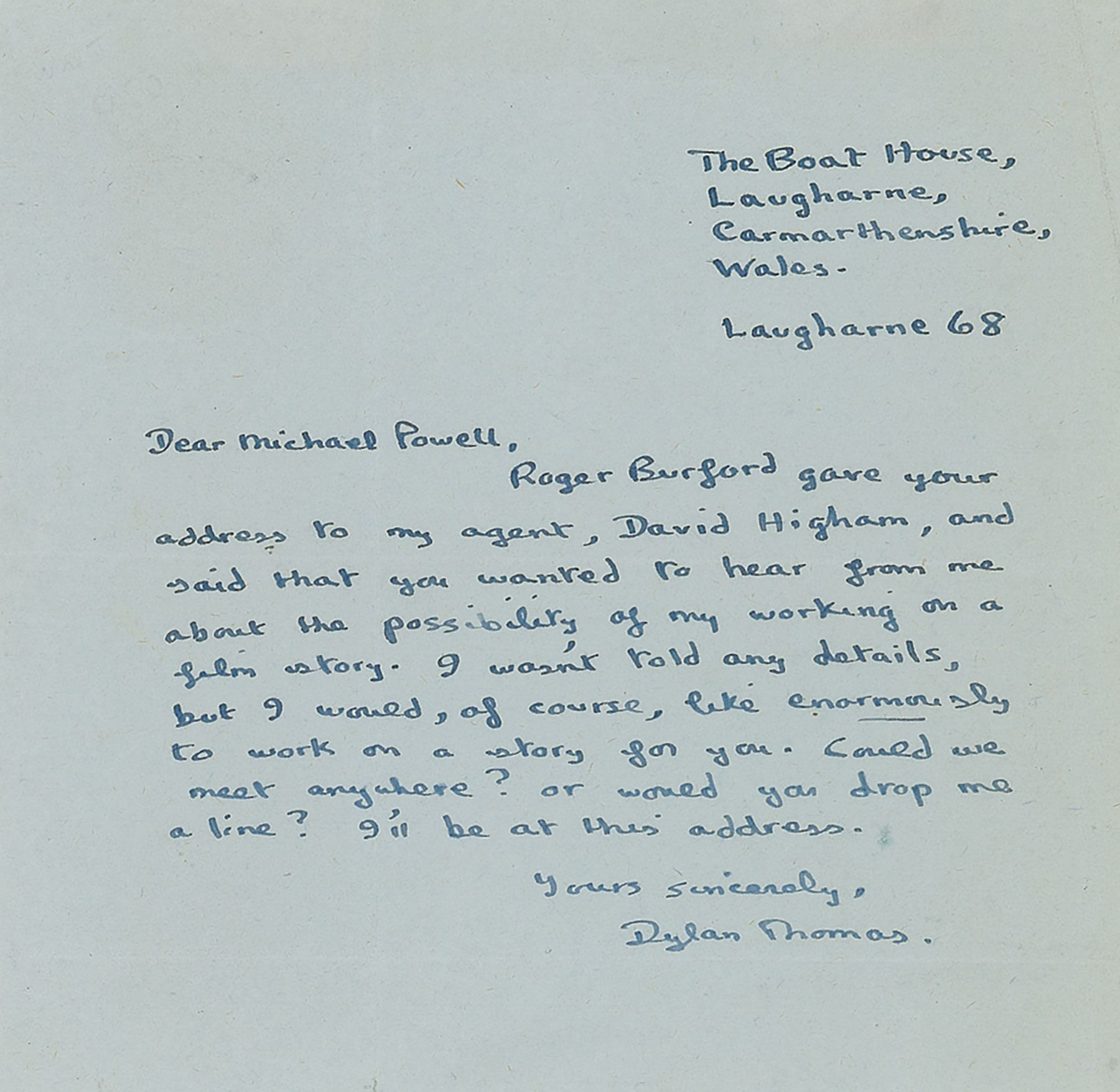 ALS, one page, 5.25 x 5, no date. Letter to to Michael Powell, written from "The Boat House" in Laugharne. In full: "Roger Burford gave your address to my agent, David Higham, and said that you wanted to hear from me about the possibility of my working on a film story. I wasn't told any details, but I would, of course, like enormously to work on a story for you. Could we meet anywhere? Or would you drop me a line? I'll be at this address." In fine condition, with neatly trimmed edges. Powell (1905–1990), a prominent British author and film director, helmed such classics as Black Narcissus and The Red Shoes. Though Powell and Thomas planned to collaborate with Igor Stravinsky on a series of films in the 1950s, the project evidently never came to fruition.