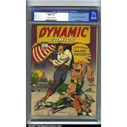 Dynamic Comics #1 (Chesler, 1941). In 1941, Harry Chesler tried his luck at the superhero genre by releasing a new line of comics ("They're new! They're different!"), featuring the likes of Major Victory and Yankee Doodle Jones. His titles would later evolve into a bizarre array of psychedelic covers, now highly sought after by collectors. This is an attractive mid-grade copy, with only minor imperfections. CGC FN/VF 7.0 Off-white to white pages. Overstreet 2001 FN 6.0 value = $505; NM 9.4 value = $1,600. Important notice: We expect to be auctioning lots at the rate of 200-250 per hour. Sometimes eBay Premier live bid software cannot keep up with that pace, so we strongly recommend that you place a realistic proxy bid now as insurance to avoid disappointment. Also please note that all Heritage/CAA lots purchased through eBay Premier carry a 20% Buyer's Premium.