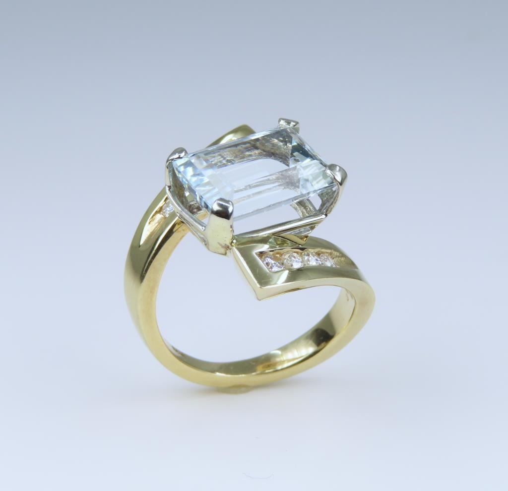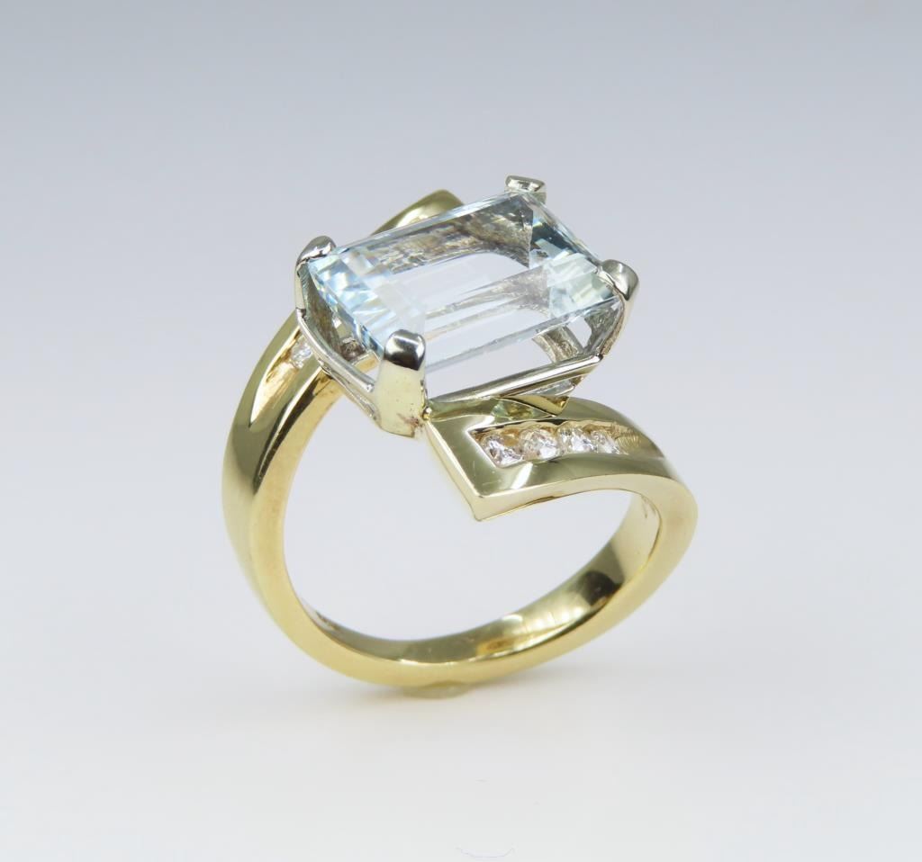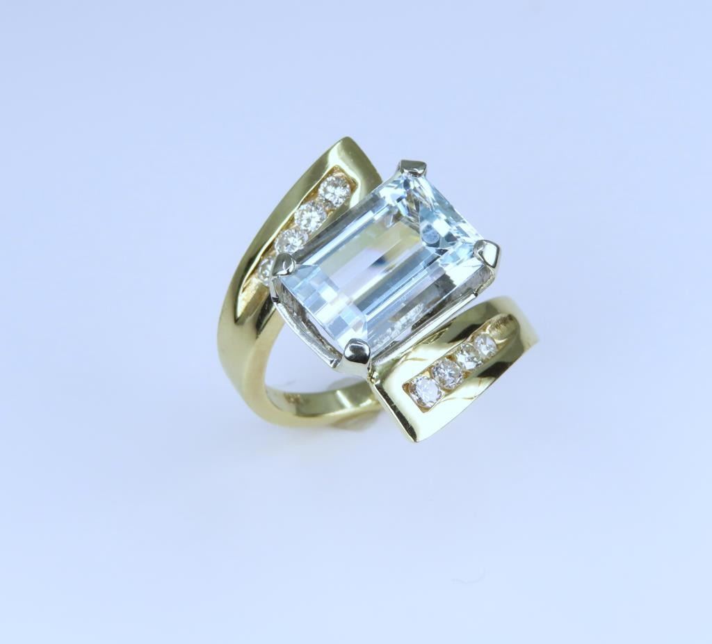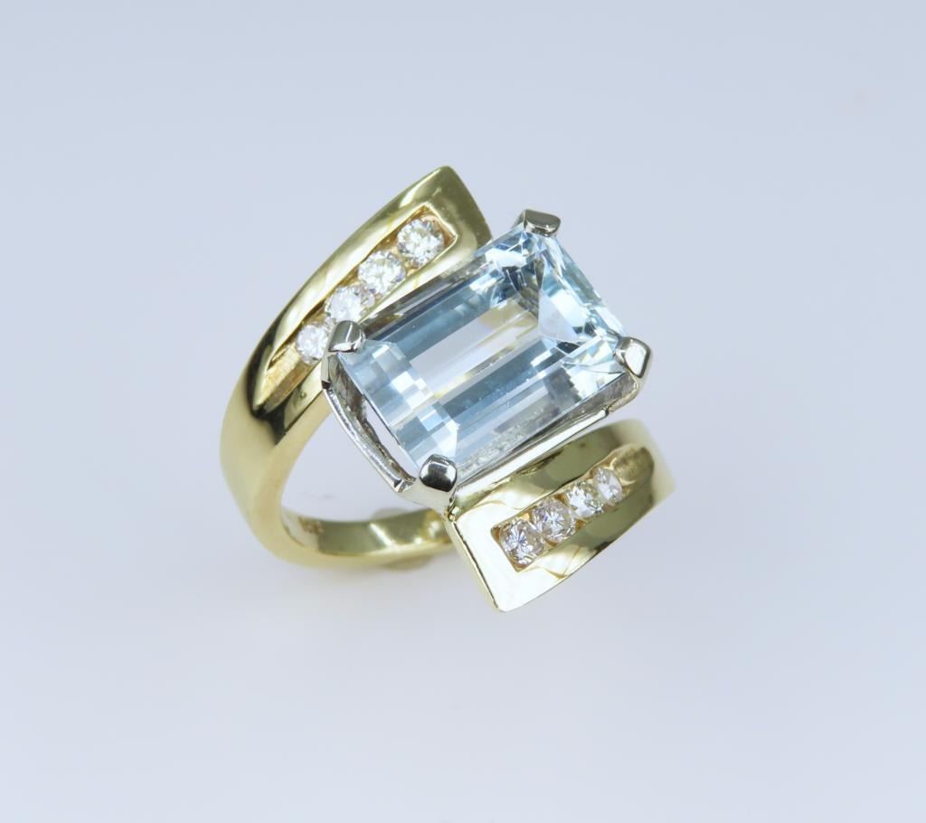 featuring an emerald cut Aquamarine weighing approx. 6.00 carats accented with 8 channel set round cut Diamonds weighing approx. 0.30 carats with G-H colors and VS clarity set in a striking contemporary setting crafted 14 karat yellow gold, ring size 6½. Retail $6,000-7,000