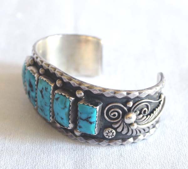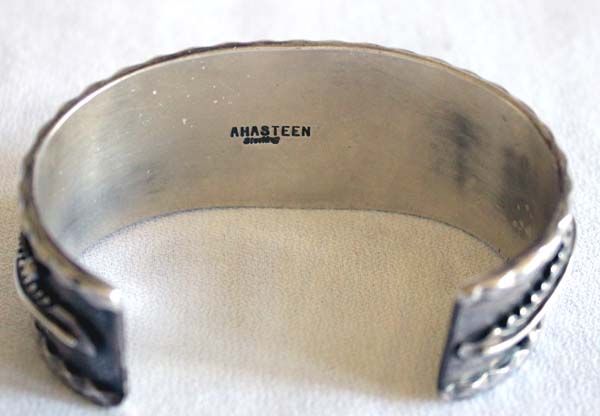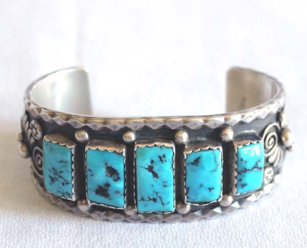 Dynamic Navajo Sterling Silver Turquoise Bracelet - Tom Ahasteen, inside measures 7.5'' which includes opening x 1.25''W, sterling silver bracelet set with 5 Bisbee Blue turquoise cabochons (largest measures .75'' x 3/8''), beautiful matrixed stones, hallmarked Ahasteen and stamped silver, traditional setting of scrollwork, leaves, spherical and peyote bead accents, hammered silver edging, 97.02g in total wt. Truly a work of art!