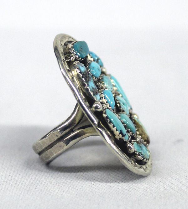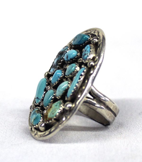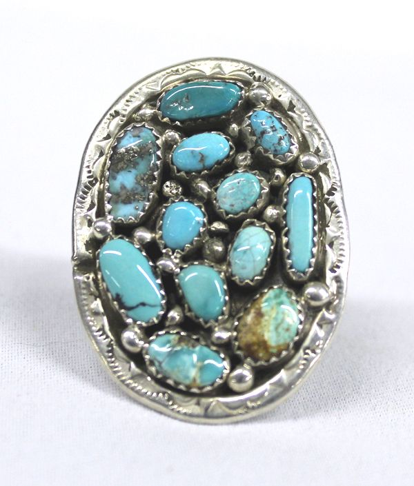Dynamic Vintage Navajo Silver Turquoise Ring - Jason Livingston, size 9.5, Sterling silver turquoise cluster ring, features 12 gorgeous turquoise cabochons (largest measuring 7/16'' x 3/8''), gorgeous hand stamped border, double band shank, measures 1.75'' x 1.25'', hallmarked J and stamped sterling, 18.86g in total wt. Great vintage find, large bold traditional ring