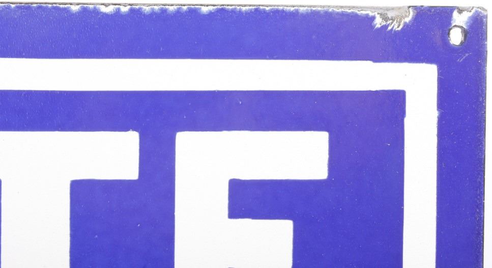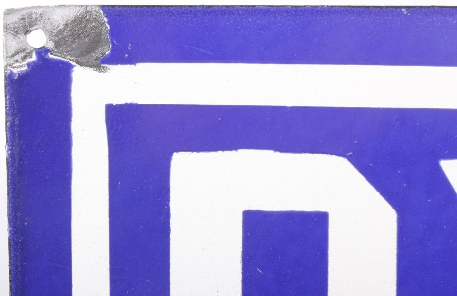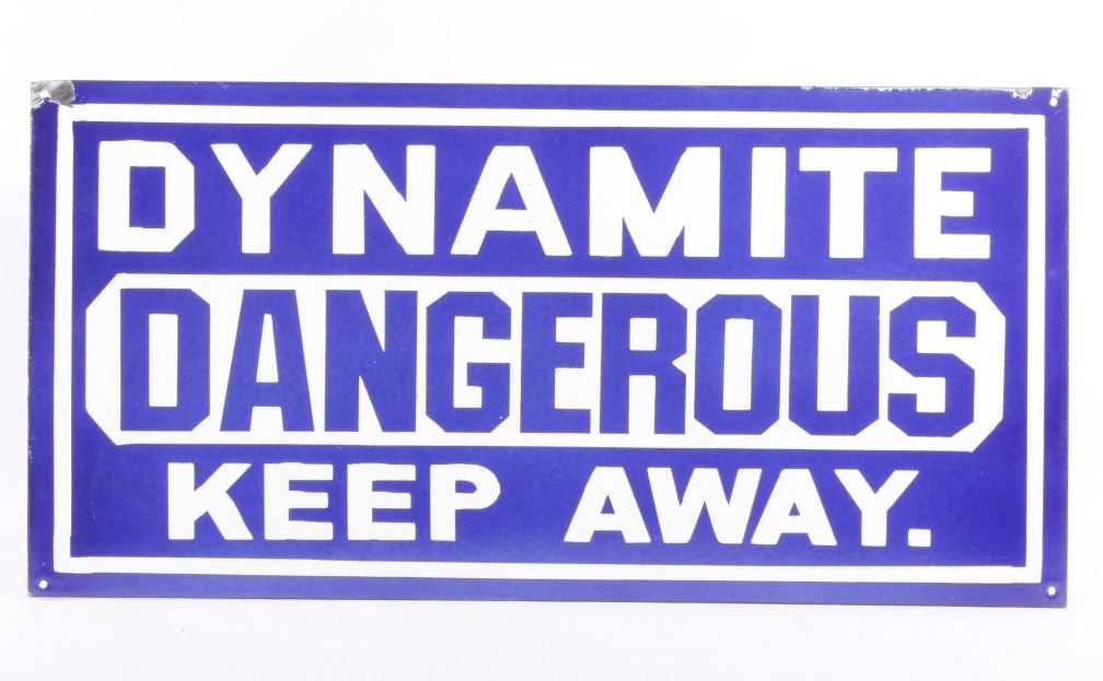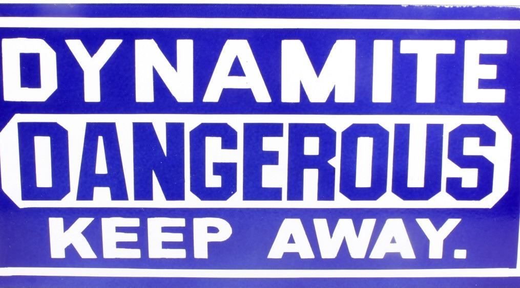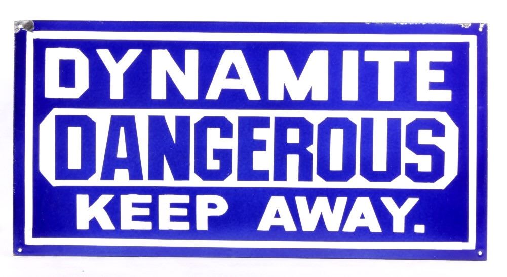 This is a Dynamite Mining Porcelain Enamel sign showing bright blue and white coloring. Other exact signs are marked, "BSS SIGN WORKS 9-48" with the number either the inventory code or dating the piece to circa 1948 (this sign is not marked on bottom edge). The sign shows very well preserved condition (possibly new old stock), but does shows minor chipping on the edge. The sign measures 12" x 24".