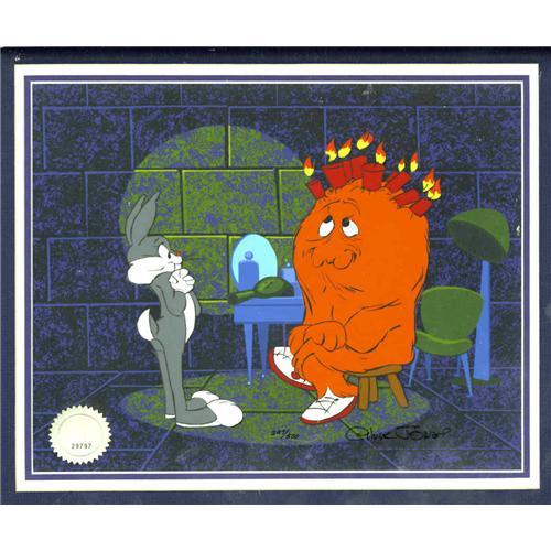 <B>Dynamite Hare "Bugs Bunny" Limited Edition Hand-Painted Cel #297/500 Original Art (Warner Bros., 1993).</B></I> Bugs Bunny has a special birthday surprise for Gossamer's new makeover. In this Chuck Jones limited edition cel, "Dynamite Hare," Bugs is creating a "Dynamite Hairdo" for the shaggy mass of hair. Created from an original hand-inked drawing by Jones, which was serigraph screen printed on a clear acetate sheet, and expertly hand-painted. This edition is number 297 of a limited edition of 500. The art has an image area of 12" x 10" and the condition is Excellent. Includes a certificate of authenticity. Signed by Chuck Jones at the lower right.