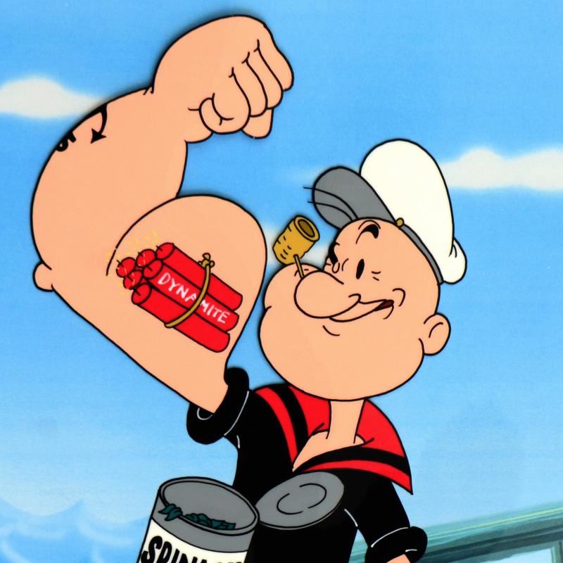 "Dynamite Muscle" is a limited edition hand inked and hand painted animation cel with background, numbered and hand signed by Myron Waldman (1908-2006). Includes Certificate of Authenticity! Measures approx. 14" x 12" (background), 11" x 9" (cel).