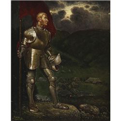 POLISH SCHOOL (19th/20th century), Knight Holding a Red Flag Overklooking a Village - 1912, Oil on canvas, Signed lower left...