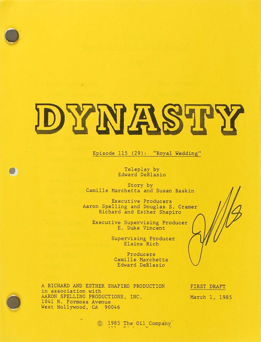 Brad-bound copy of the first draft script for the Dynasty episode entitled Royal Wedding, dated March 1, 1985, 8.5 x 11, 51 pages, signed on the front cover in black felt tip by James. In fine condition.