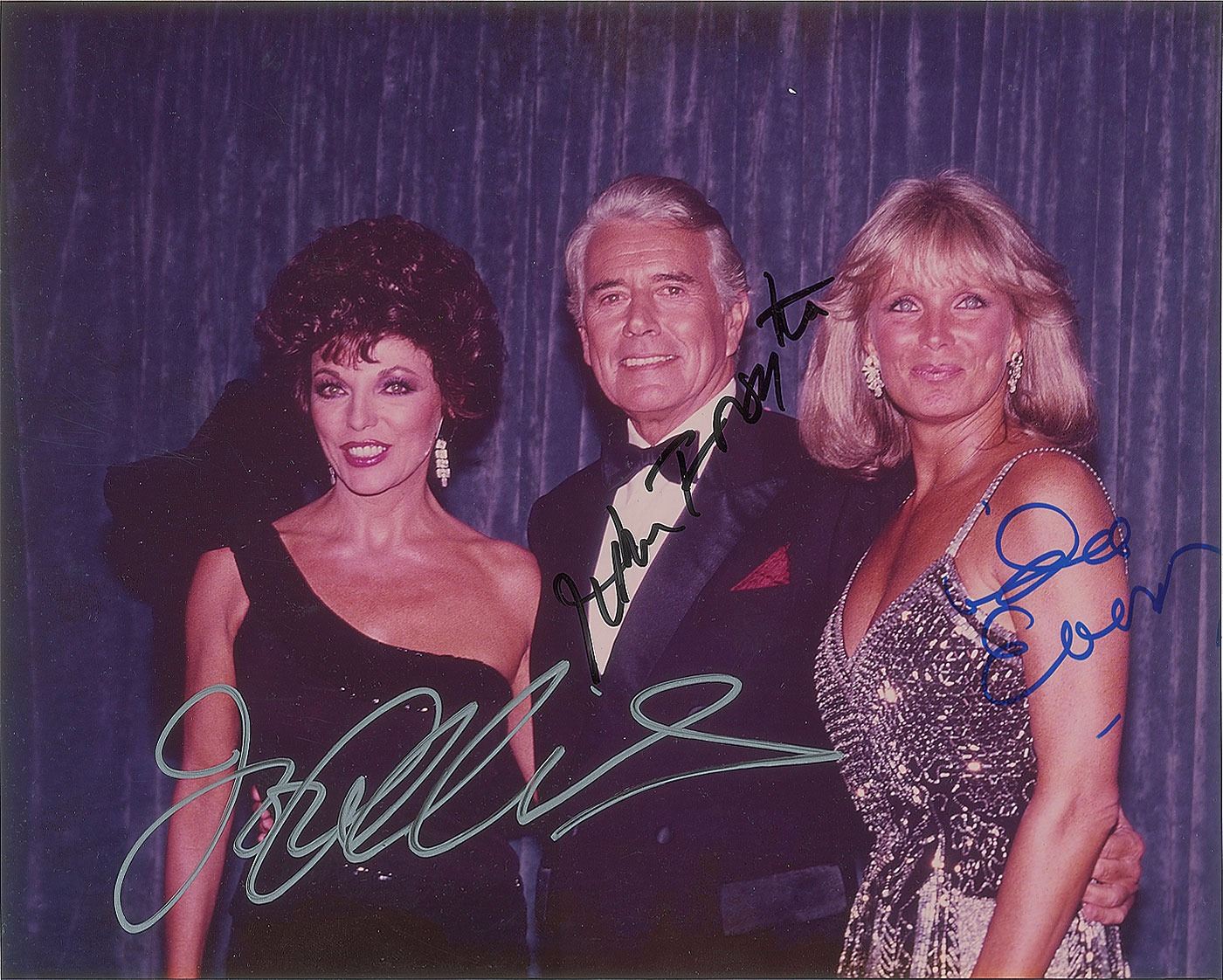 Color glossy 10 x 8 photo of the Dynasty cast, signed in silver ink by Joan Collins, black felt tip by John Forsyth, and blue felt tip by Linda Evans. In fine condition. From the Harvey and Rhoda Kuflik Collection.
