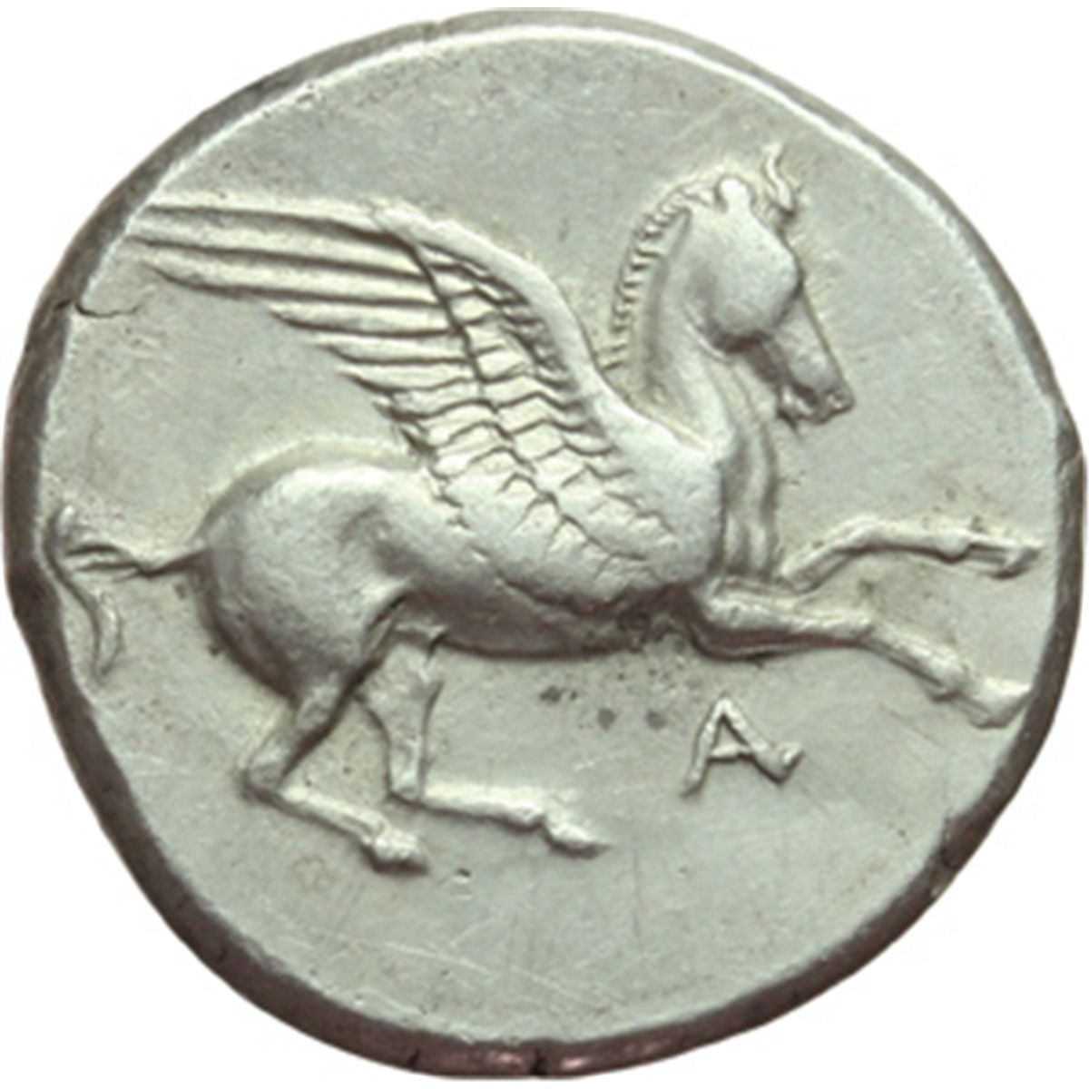 Mondo Greco. Grecia Continentale. Dyrrhachium. Statere, dopo il 350 a.C. D/ Pegaso che vola a destra. Sotto, Δ. R/ Testa di Athena a destra. Sopra la visiera dell'elmo, delfino. Dietro, clava. Sotto la base del collo, Δ. Sotto il mento YP. Calciati 32. AG. g. 8.78 mm. 20.50 R. qSPL/SPL.