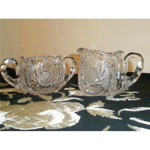 WE PRESENT TO YOU MUSEUM QUALITY, A MATCHING PAIR OF, HAND CUT HAND POLISHED E.A.B.P. SUGAR AND CREAMER. THIS IS THE MOST BRILLIANT PAIR I HAVE EVER SEEN BAR NONE. DEEP CUTTING WITH MITERED HIGHLIGHTS SHOWING A PINWHEEL DESIGN ENCIRCLING A TWELVE POINT HOBSTAR ON TWO SIDES OF THE CREAMER WHICH ALSO SHOWS A PATTERN OF FOUR HOBSTARS,TWO STARS AND MITER CUT HIGHLIGHTS UNDER A ZIPPER CUT POUR SPOUT. THE SUGAR SHOWS THE SAME ON TWO SIDES WITH DOUBLE NOTCH CUT HANDLES.- HANDLES ON BOTH ARE APPLIED- THE BOTTOM OF BOTH SHOWS A RELIEF TYPE HOBSTAR ENCIRCLING A PLATFORMED HOBSTAR. I ALMOST FORGOT TO MENTION THE SCALLOPED -SAW TOOTHED RIM. OH AND THE UNIQUE BLOCK STYLED AREA IN FRONT OF THE APPLIED HANDLES.THE WEIGHT OF THE PAIR IS JUST OVER THREE AND ONE HALF POUNDS.THESE ALSO WERE RECENTLY ACQUIRED AT A LOCAL RENO,NV. ESTATE SALE. THESE WERE DISPLAYED NOT USED. amazing