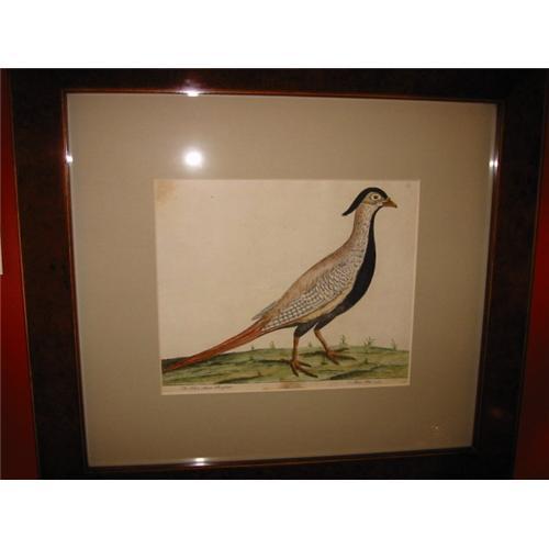 Eleazar Albin was an important Draftsman, watercolorist and Scientist of German origin. He lived in London. This rare print is one of 306 plates of a volume called: The Natural Science of Birds. This was produced between 1720-1740. This is an original pull, is signed and dated and hand colored by the artist. Title of this peice is " White Chinese Pheasant ". THere are no folds in the paper. With in the frame and including the frame the size of the entire print is : 20 1/2 wide by 18 1/2 high. The print condition is very good and here are no visible marks or flaws.