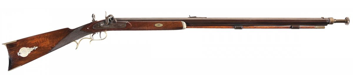 The engraved lock plate is marked "E. ANSCHUTZ/PHILADELPHIA" and the barrel is marked "E. ANSCHUTZ PHILADELPHIA" on the top flat towards the breech. Blade front sight, elevation adjustable rear sight and tang peep sight. The fish hammer, bolster and barrel tang are also engraved. The rifle is equipped with double set triggers. The trigger guard, crescent buttplate and patch box are German silver and feature floral and scroll engravings. The ramrod pipes are iron and hold a brass tipped wooden ramrod. The half stock has a checkered wrist, single barrel wedge and pewter forend cap. Has a bullet starter.