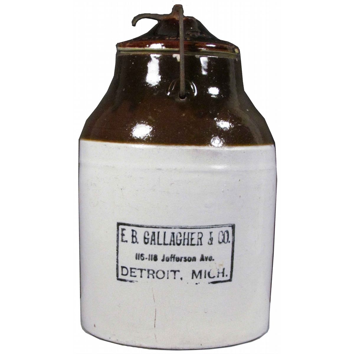 E.B. Gallagher & Co. Crock, Detroit, Mich. Normal crazing, tiny chips on lid and rim otherwise very good condition. 6 1/2 inch diameter X 11 1/2 inches tall.