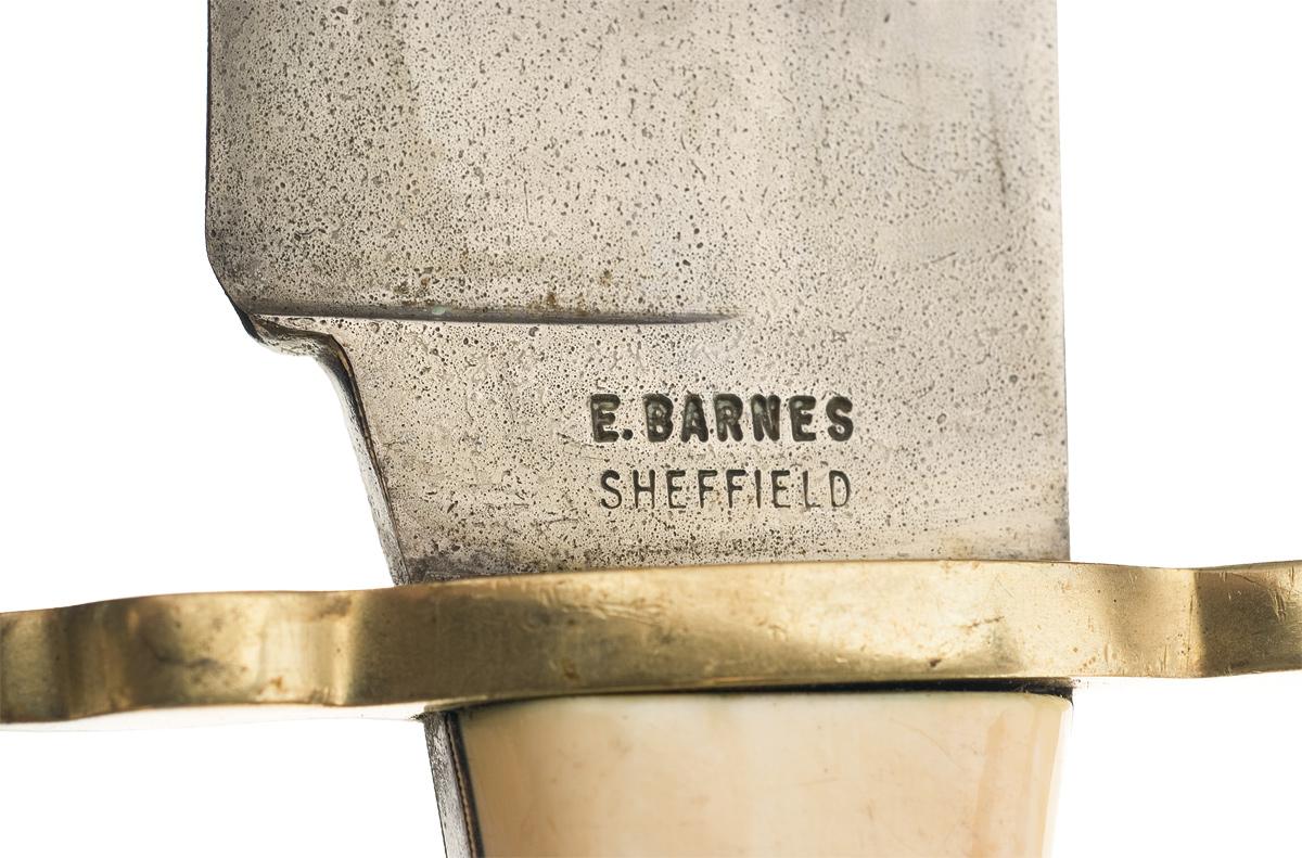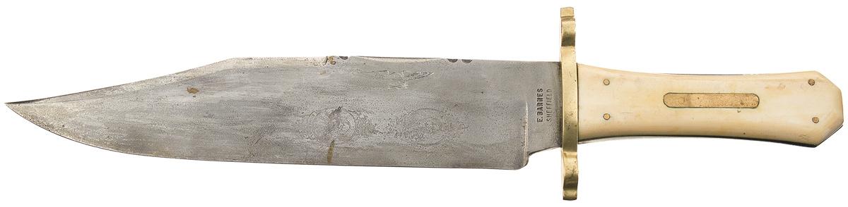This English bowie knife has a 9 3/4" blade marked "E. BARNES / SHEFFIELD" and a spread winged eagle on the left side. Dates to late 19th or early 20th Century. The left side of the blade also has etched portraits of Victor Emmanuel and General Giuseppe Garibaldi, two Italian military and political figures. Fitted with ivory scales with an inlaid brass plate and secured with four rivets. OAL: 14 1/2"