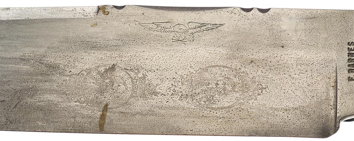 Condition: About good. The blade has been cleaned and is now bright. Evidence of prior surface pitting throughout. The left side has traces of the etching remaining. The ivory handle has a nice even aged ivory patina. The scales have a few hairline age cracks and some minor handling marks.