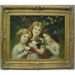 E. Beccari, three girls with rabbit, oil on canvas, signed (L.R.), framed, image measures 24" x 30"
