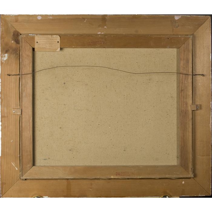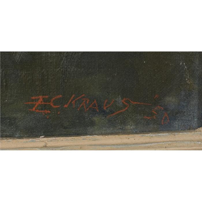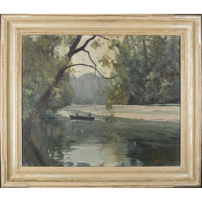 Edward C. Kraus, 20th C., Michigan. Oil painting depicting two fisherman in a canoe on a wooded river. 20" H x 24" W, signed E.C. Kraus and dated '50 in LR. Detroit Institute of Arts exhibition tag en verso, with original price of $100.