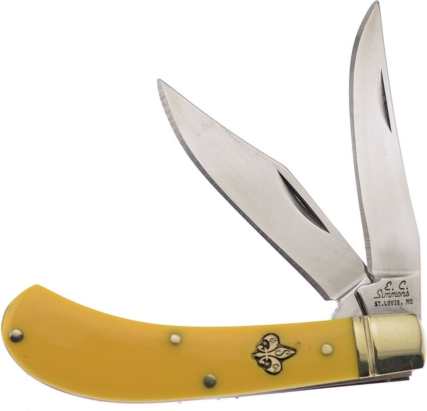 3 1/2" closed. Stainless clip and skinner blades. Yellow composition handles with nickel silver bolster and inlay shield.
