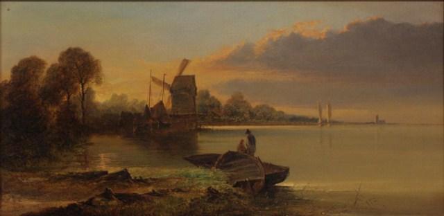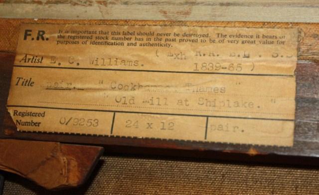 Edward C. Williams (British 1807-1881) oil on canvas depicting an old mill on a lake. Titled: "Old Mill at Shiplake". Signed lower left. Measures 12" h X 24" w + 2 1/2" matte and frame. Certificate of authenticity attached to back. Edward C. Williams was the eldest son of Edward Williams. A student of his father, his style and technique remained close to that of his master. Like the other members of his family he specialized in landscapes. His favorite time of day to portray was morning, often capturing the sun's effects in large, open, tranquil views in Barnes, Cumberland, Kent, Surrey and along the Thames.
