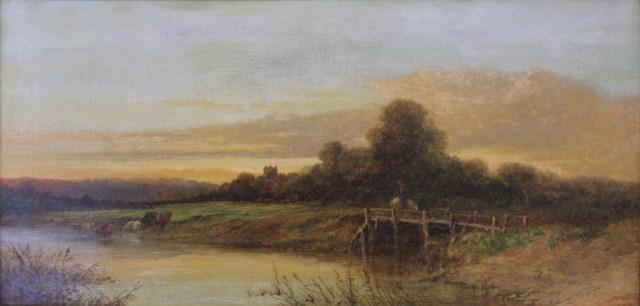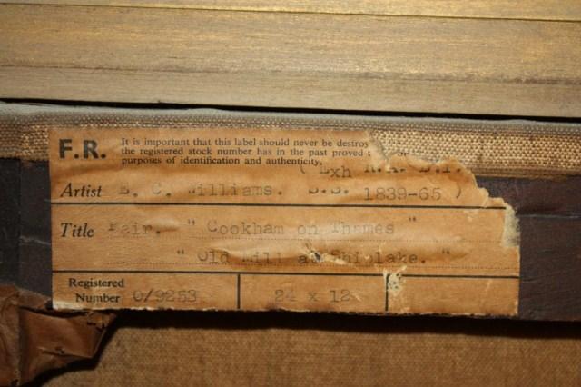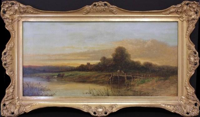 Edward C. Williams (British 1807-1881) oil on canvas depicting stream with wooden bridge. Titled "Cookham on Thames". A man and a man on a horse can be seen crossing the bridge. A group of bulls and cows can be seen crossing the stream. Measures 12" h X 24" w + 2 3/4" matte and frame. Certificate of authenticity attached to back. Edward C. Williams was the eldest son of Edward Williams. A student of his father, his style and technique remained close to that of his master. Like the other members of his family he specialized in landscapes. His favorite time of day to portray was morning, often capturing the sun's effects in large, open, tranquil views in Barnes, Cumberland, Kent, Surrey and along the Thames.