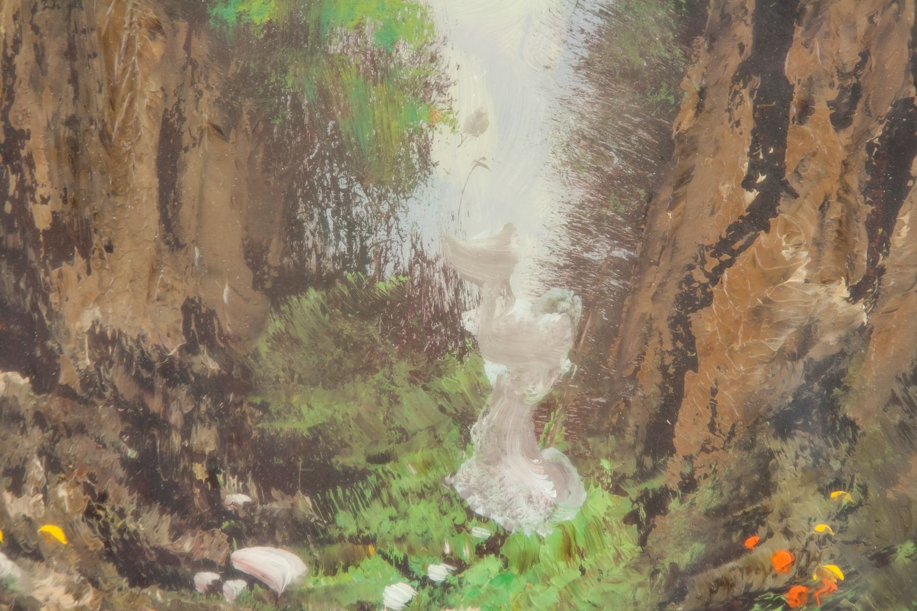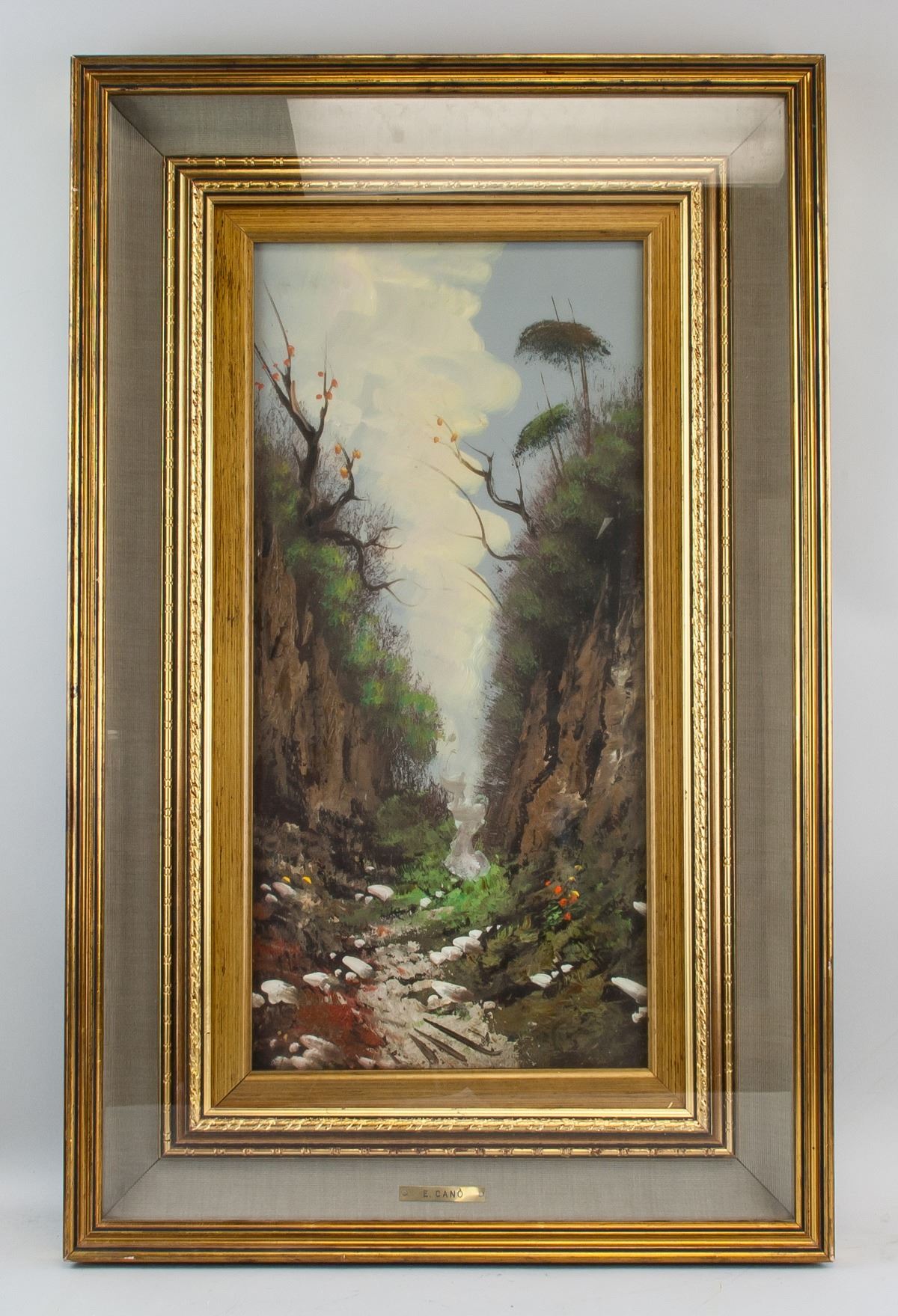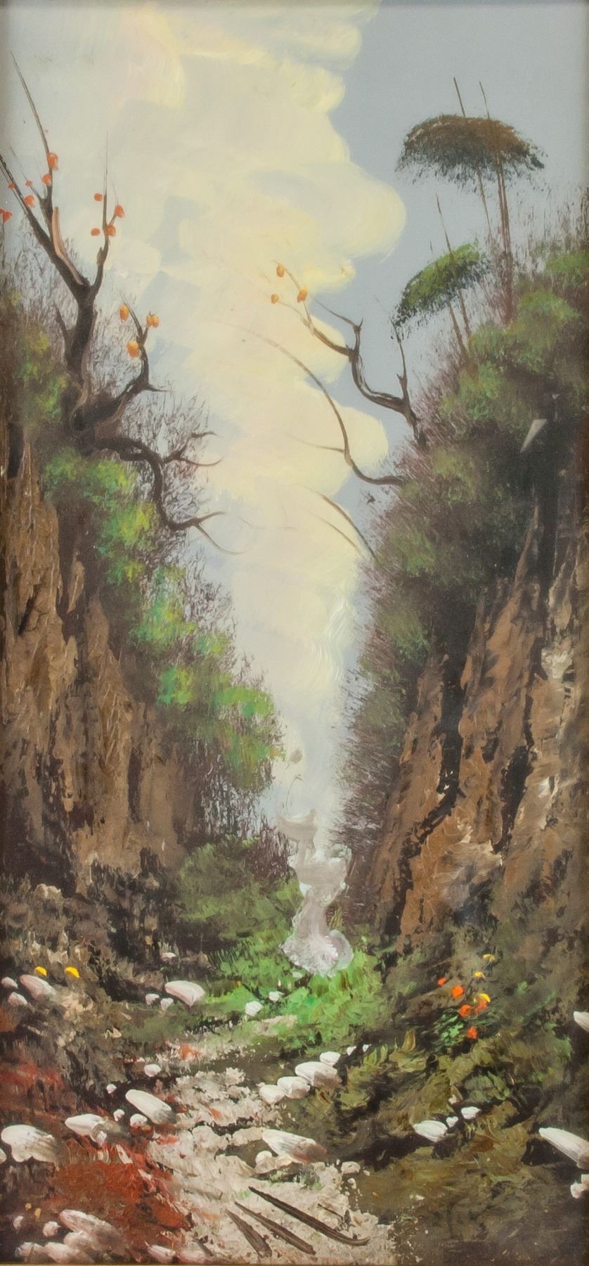 Oil on board framed. Featuring a vertical nature landscape scene. Artist's name plaque attached on the lower bottom. 56 x 27 cm (22 x 10.6 in)