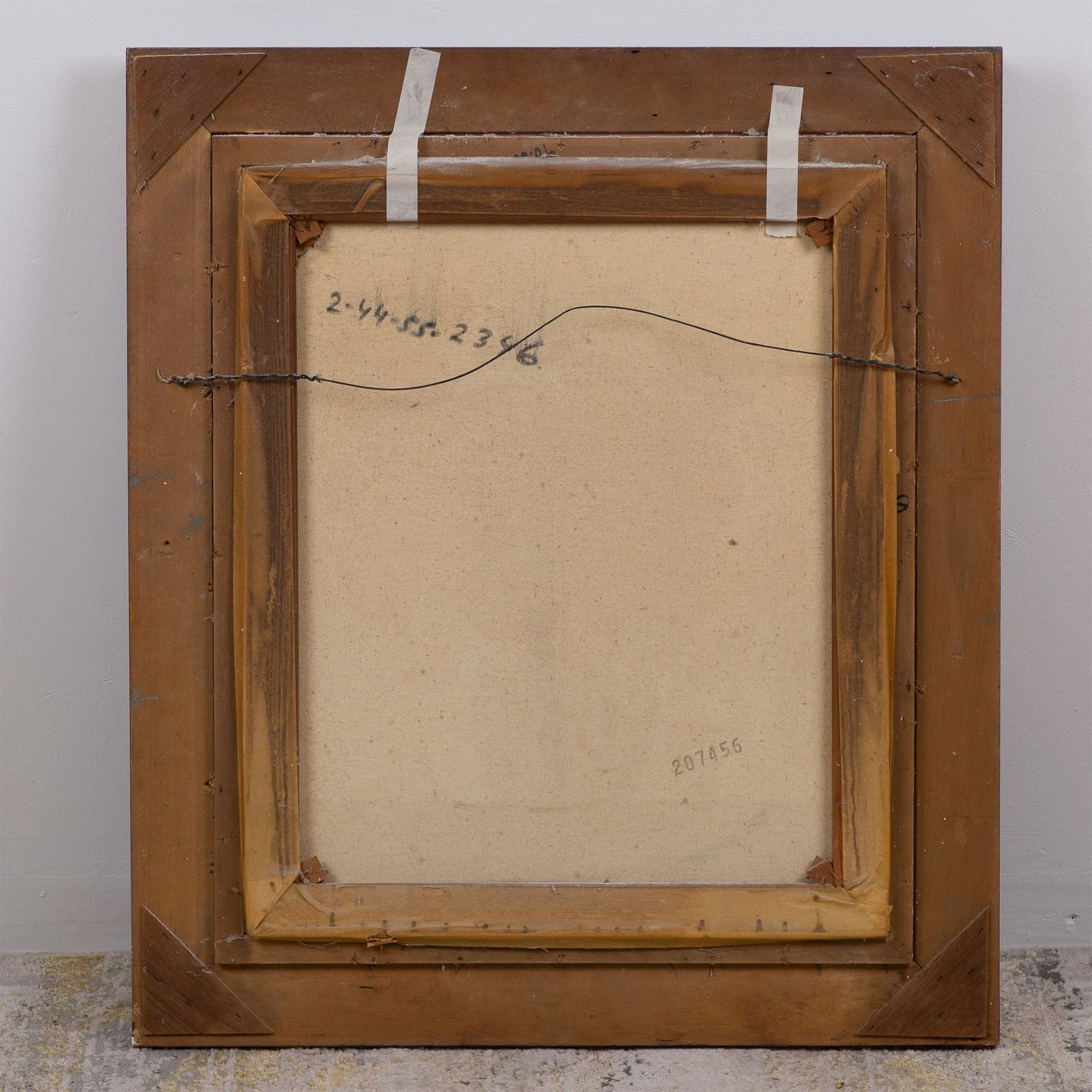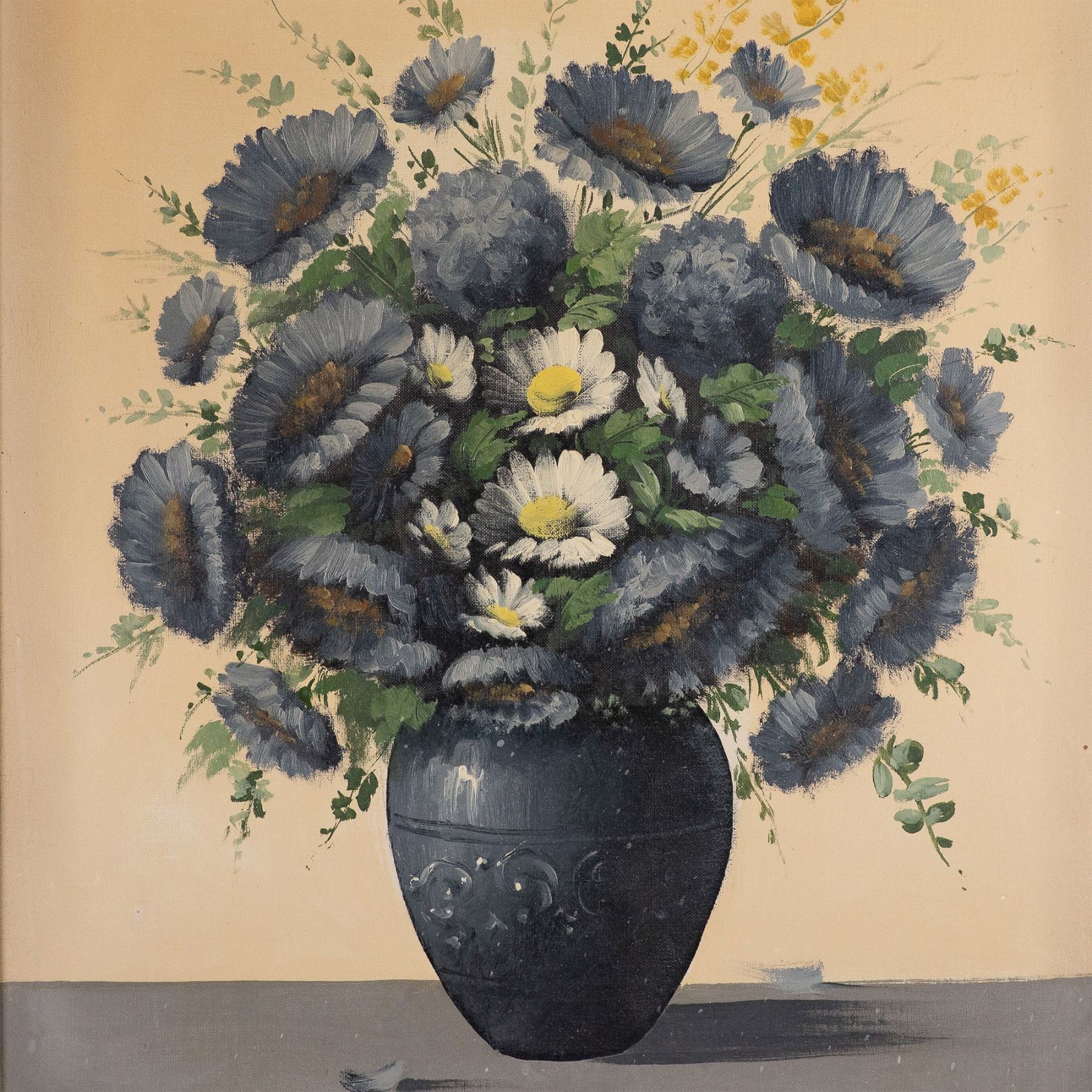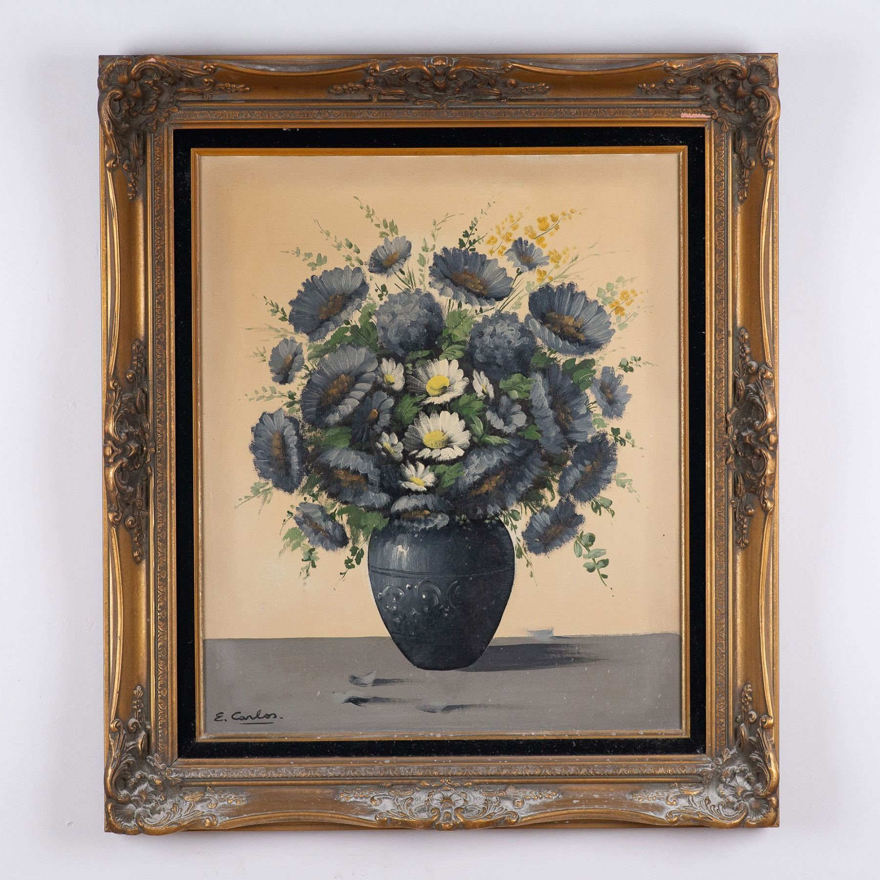 This elegant still-life oil painting by E. Carlos captures a lush arrangement of flowers in a muted monochromatic palette, emphasizing texture and light. The bouquet of blooming daisies and other florals sits gracefully in a dark vase, contrasted against a neutral background. The subtle variations in shading and the artist's technique create a harmonious balance, evoking both simplicity and sophistication. The piece is executed with fine attention to detail, with visible brushstrokes that add depth and character. The gold-painted ornate frame enhances the painting's classical aesthetic, making it a perfect addition to both traditional and modern interiors. Signature on lower left side: E. Carlos. Housed in an ornate wooden frame with a black velvet border. Artwork dimensions: 19.50"L x 23.25"H. Frame dimensions: 27.50"L x 31.25"H x 2.50"W.