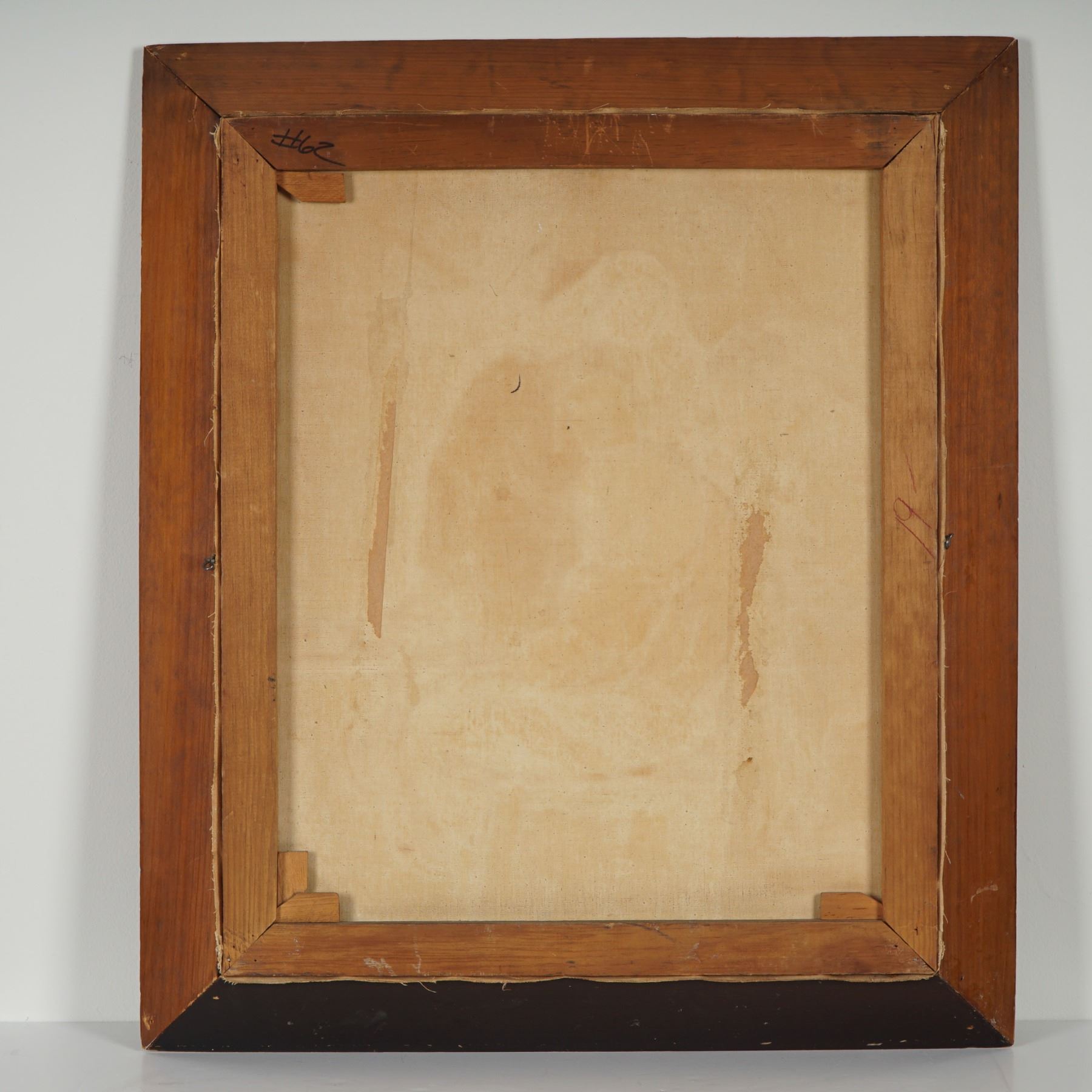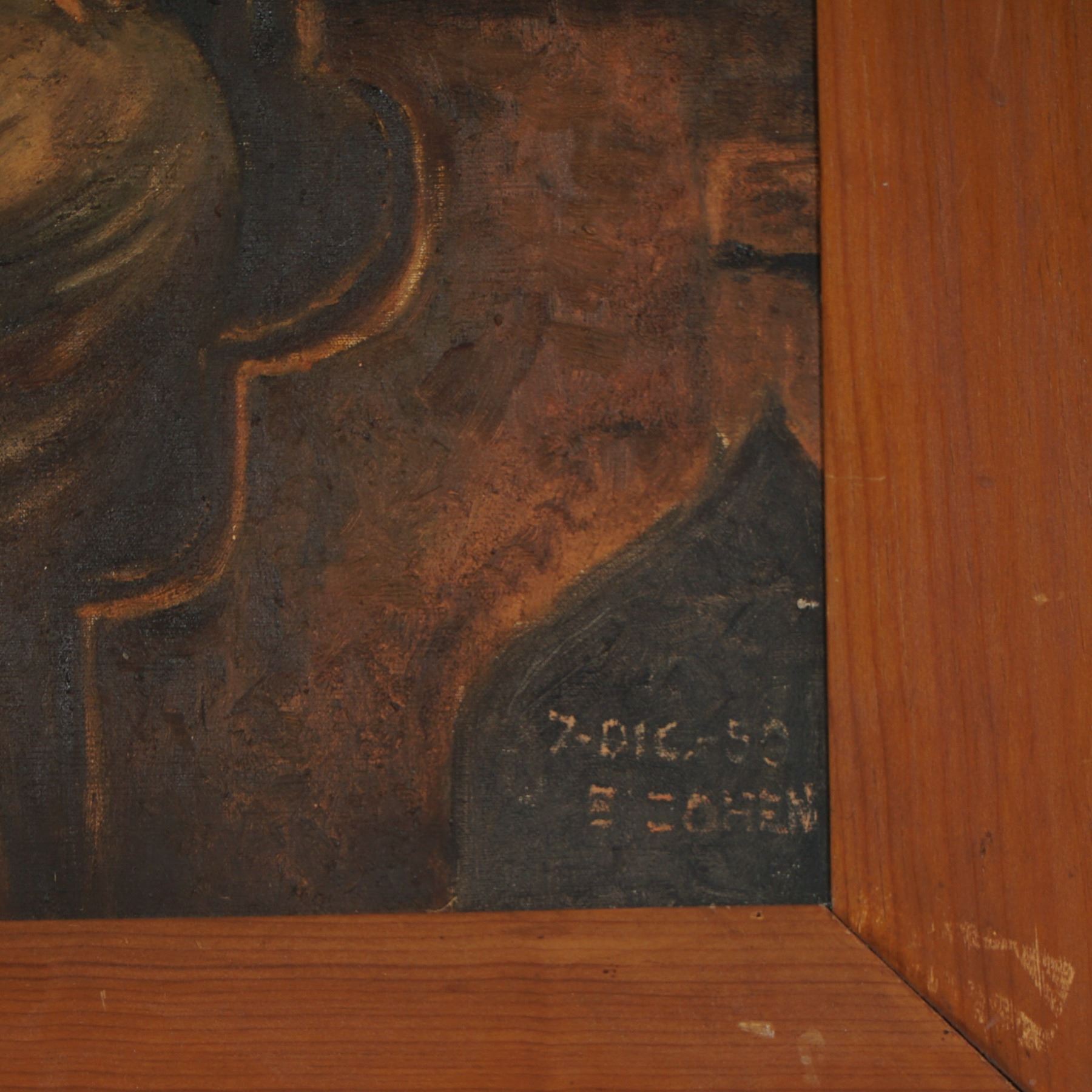 A compelling oil on canvas genre painting, signed E. Cohen and dated 7 DIC 59 (December 7, 1959) at lower right. This vividly expressive work recreates a rustic medical scene in which a man receives a painful procedure on his back, surrounded by onlookers in a dimly lit interior. The artist has skillfully captured a blend of discomfort, concentration, and amusement in the facial expressions, enhancing the theatricality of the scene. This painting is a 20th-century interpretation of The Back Operation [ca. 1636] by Adriaen Brouwer (ca. 1605-1638), a Flemish Baroque painter renowned for his vivid depictions of peasant life and tavern scenes. The homage remains faithful to the original composition while rendered in a mid-century painterly hand. Presented in a deep, beveled wood frame. Craquelure and surface darkening consistent with age. Frame shows wear and scuffing. Canvas remains tight and stable.