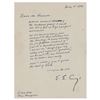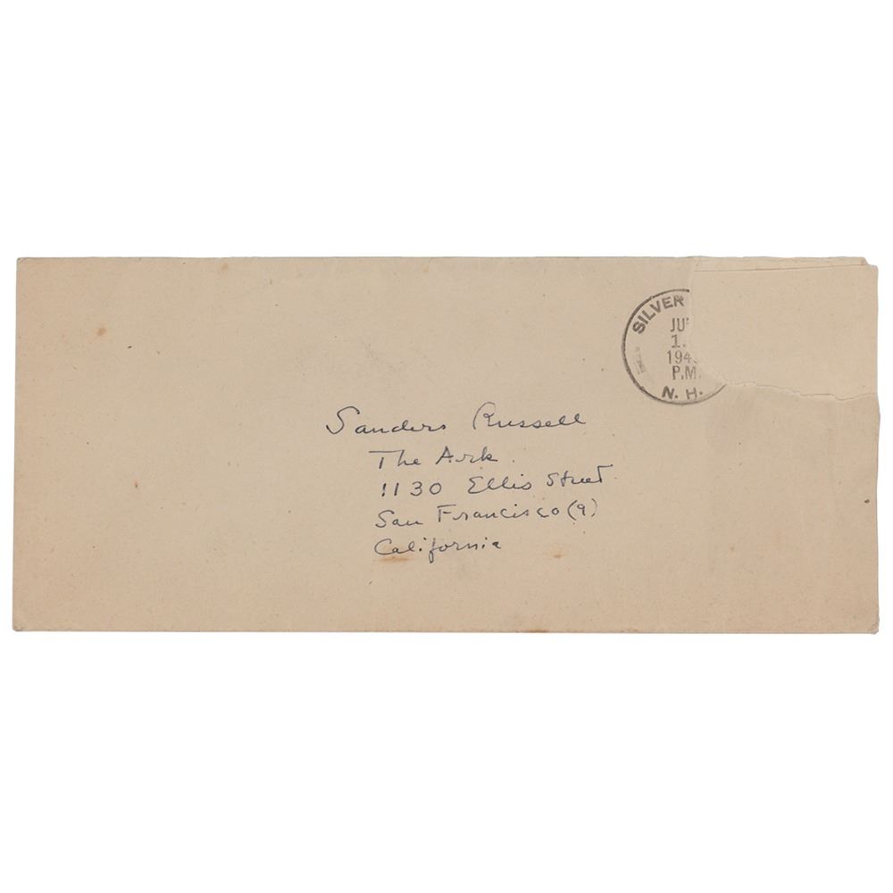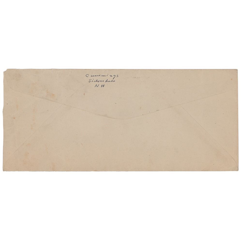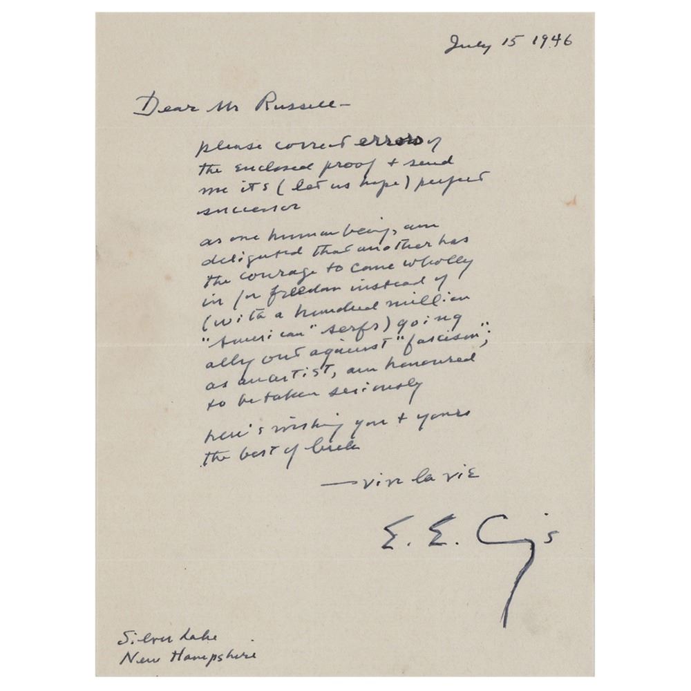 ALS, one page, 5.75 x 7.75, July 15, 1946. Letter to poet Sanders Russell, stylishly written with parentheticals and line breaks evocative of his poetry, in full: "Please correct errors of the enclosed proof & send me its (let us hope) perfect successor. As one human being, am delighted that another has the courage to come wholly in for freedom instead of (with a hundred million 'American' serfs) going ally out against 'fascism'; as an artist, am honoured to be taken seriously. Here's wishing you & yours the best of luck—vin la vie." In fine condition, with Cummings evidently retracing his own signature. Accompanied by the original mailing envelope, addressed in Cummings's hand and incorporating his surname in the return address on the flap.