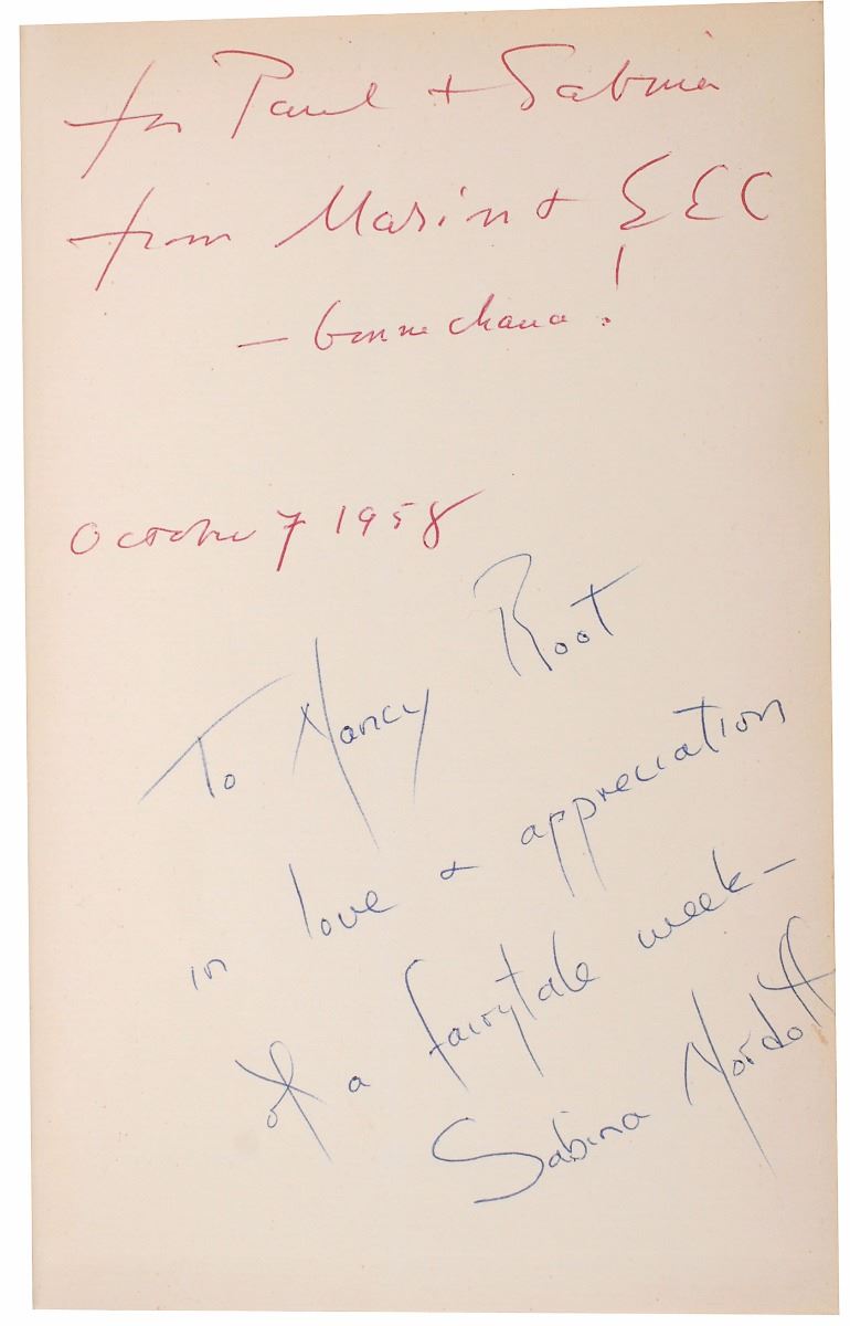 Signed book in German: Gedichte [Poems]. Ebenhausen: Langewiesche-Brandt, 1958. Hardcover with dust jacket, 5.25 x 8.25, 76 pages. Signed and inscribed on the first free end page by Cummings in red ballpoint, “For Paul & Sabina, from Marion & EEC—bonne chance! October 7, 1958.” Subsequently also signed and inscribed by Sabina Nordoff. Some chipping and paper loss to dust jacket, otherwise fine condition. Paul Nordoff was a composer and pioneer in music therapy, and his wife Sabina was a eurythmist.