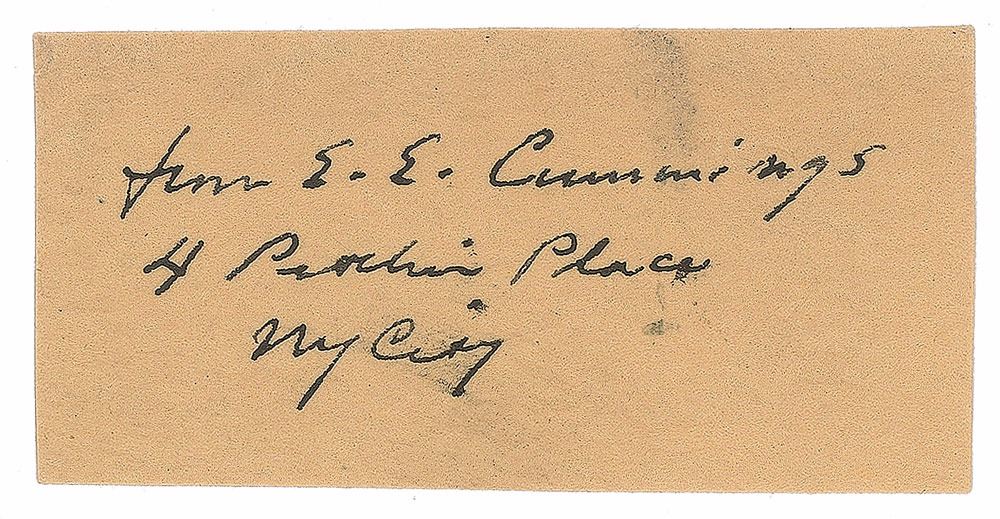 Ink signature, “from E. E. Cummings, 4 Parlin Place, NY City,” on an off-white 2.25 x 1 slip. In fine condition, with a couple small spots of soiling.