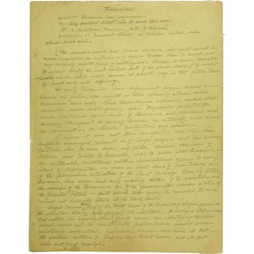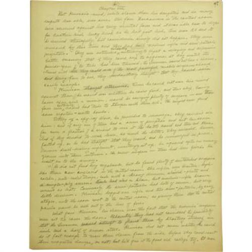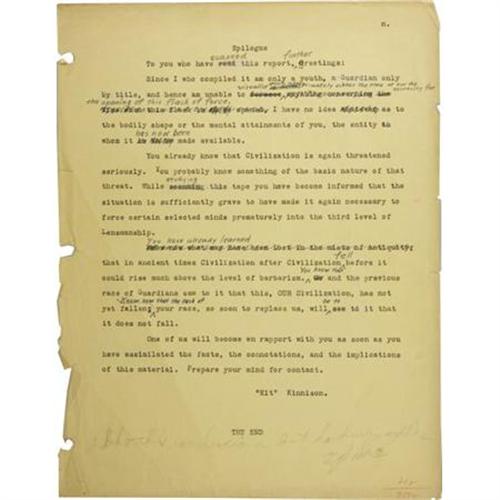 <B>E. E. "Doc" Smith. </B></I><B><I>Children of the Lens.</B></I></B></I> [N.p.: n.d.]. <BR>Holograph manuscript. Large quarto (10.9375 x 8.4375 inches). 228, [14] numbered pages. Written in pencil primarily on rectos only on yellow paper (pages 221-228 are written in ink). Pages 59-60 are typescript (ribbon copy), pages 78-88 are written in pencil on smaller ruled paper, and the final fourteen pages ("CHAPTER XXVII, The Power of Love") are typescript (ribbon copy) on yellow paper with three holes punched in the left margin, and are lettered "a"-"n."<BR><BR>Chemised in a burgundy cloth clamshell case with black leather spine label decoratively stamped and lettered in ink.<BR><BR><I>Children of the Lens, </B></I>the sixth and concluding volume of the Lensman series, was first published serially in <I>Astounding Science-Fiction,</B></I> November-December 1947 and January-February 1948. The first book edition, with illustrations by Ric Binkley, was published in 1954 by Fantasy Press, Reading, Pennsylvania. <I>From the Robert and Diane Yaspan Collection.</B></I><BR><BR><b>Shipping:</b> Books & Catalogs (<a target="_blank" href="http://www.heritageauctions.com/common/shipping.php">view shipping information</a>)