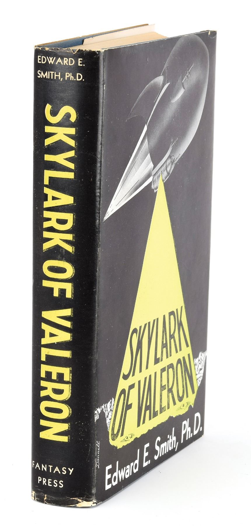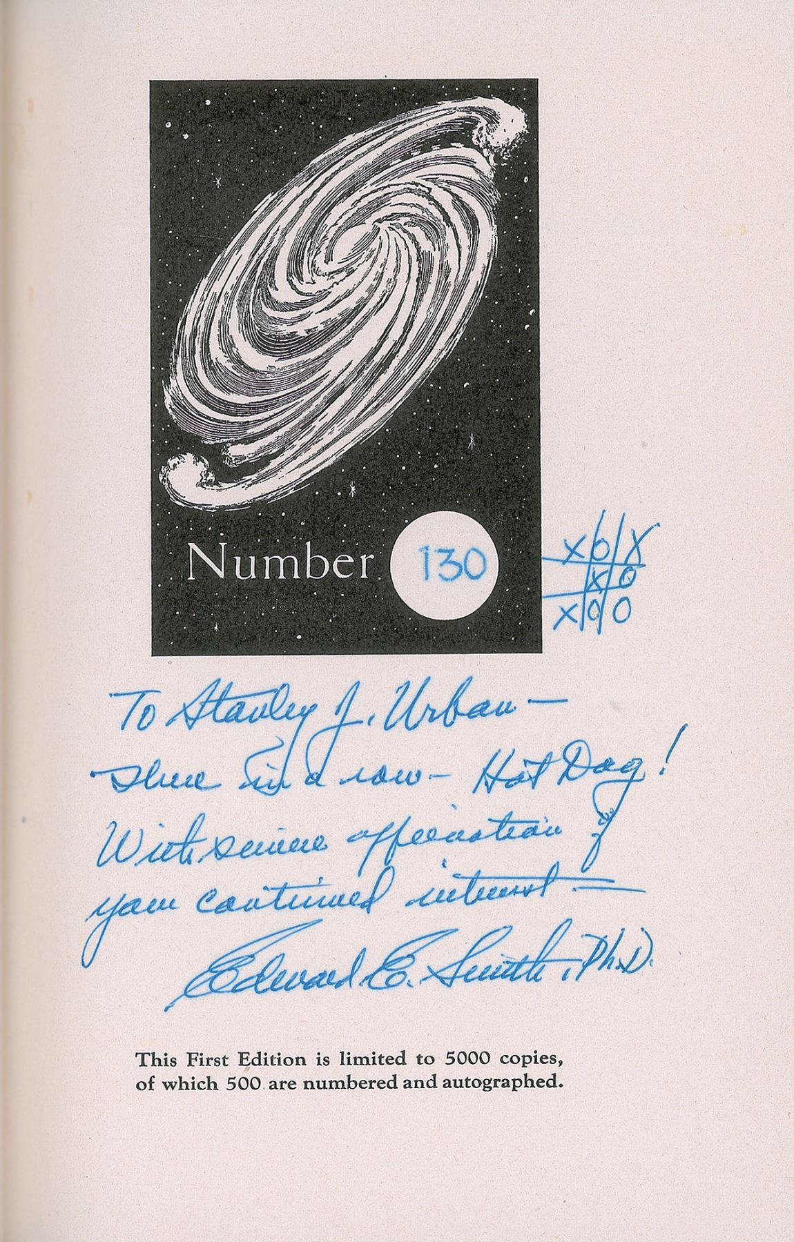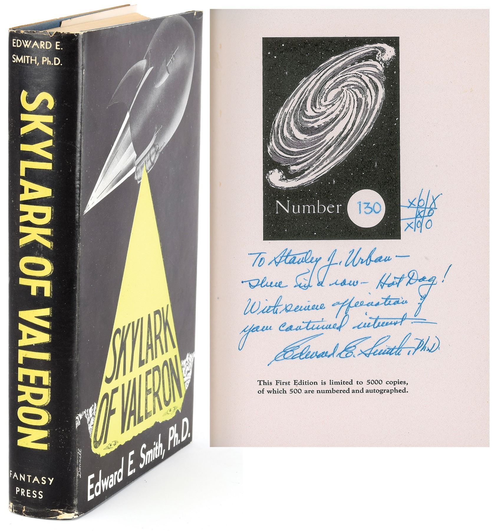 Signed book: Skylark of Valeron. First edition, limited issue, numbered 130/500. Reading, PA: Fantasy Press, 1949. Hardcover with dust jacket, 5.5 x 7.75, 252 pages. Signed and inscribed on the colophon in blue ballpoint, "To Stanley J. Urban—Three in a row—Hot Dog! With sincere appreciation of your continued interest, Edward E. Smith, Ph.D." Smith adds a small tic-tac-toe sketch above. Autographic condition: fine. Book condition:VG+/VG+.