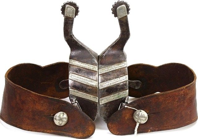 single mounted, 1 1/2" heel bands, 2 1/2" shanks and 7/8" rowels. Includes unmarked one piece leather straps. Est. 750-1200