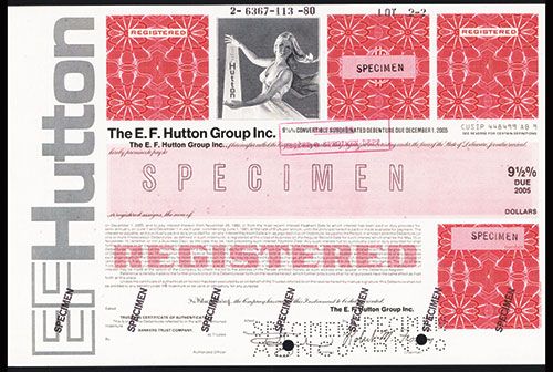 Delaware, 1980, 9 1/2% Convertible Subordinated Debenture, Specimen Bond, Black on red border and underprint, Woman with her hands below and above the company's name top center, VF-XF condition, ABNC.