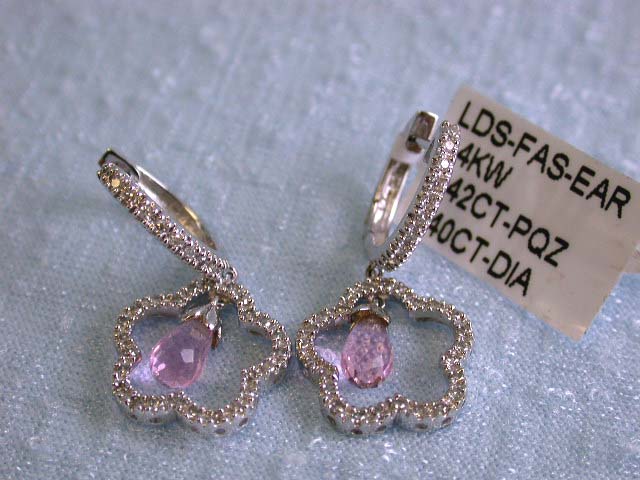 14k White Gold Earrings with Pink Quartz - 1.42 carats and Diamonds - 0.40 carat, G color and VS clarity approximately 1 inch long and weighs 3.8 grams