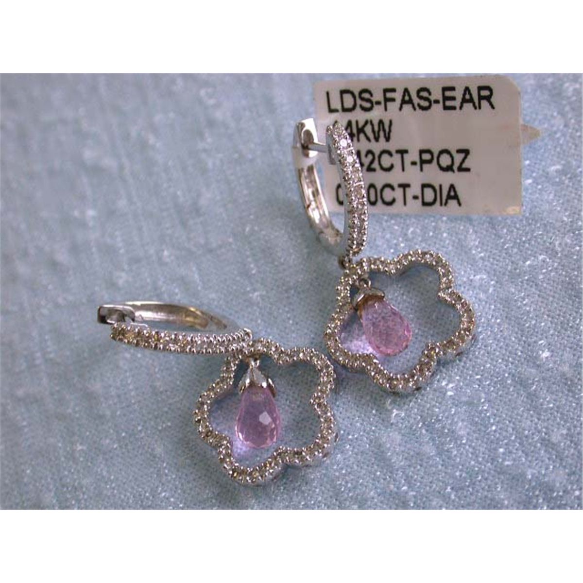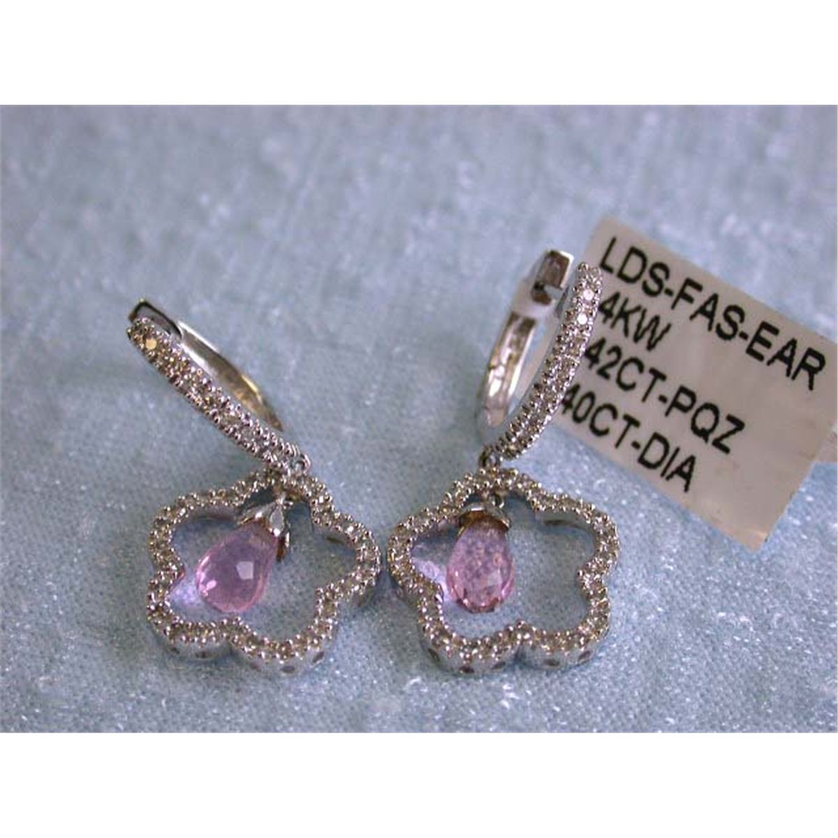 14k White Gold Earrings with Pink Quartz - 1.42 carats and Diamonds - 0.40 carat, G color and VS clarity approximately 1 inch long and weighs 3.8 grams