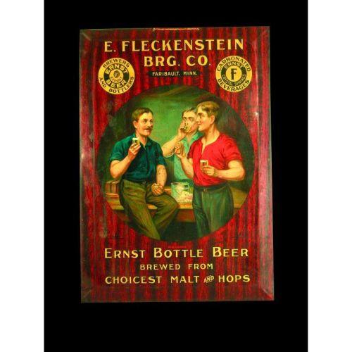 E. Fleckenstein Brewing Co. Beveled Tin Over Cardboard Sign, Ernst Bottle Beer, Faribault, MN. Some minor staining from the center to the left side otherwise very good condition, 13 1/2 x 19 inches.
