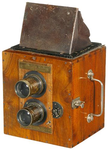 "Kinégraphe", 1887 Sehr frühe, zweiäugige Reflex-Kamera von E. Français, Paris, Platten 8,5 x 11 cm. Edelholzgehäuse in Box-Form, innen geprägt "No. 5", rot-belederter Lichtschacht. Zwei Wechselobjektive: 1) Aufnahmeobjektiv von Stereoscopic Co. in London, 5 x 4 Twin Artists Nr. 17213, für Steckblenden. - 2) Sucherobjektiv mit Nr. 17212. Beide Objektive mit Bajonettfassung! Sektorenverschluß mit Bezeichnung 0,1,2,3. - Literatur: ähnlich Michel Auer, "Kameras gestern und heute", S. 190. - Ein echtes Museumsstück!