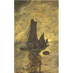 E.G.- Oil on canvas of sailing boats at sunset, 40cm x 25cm