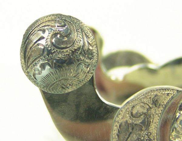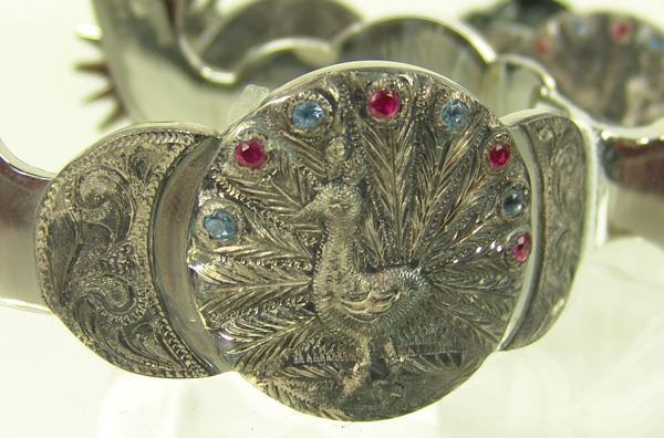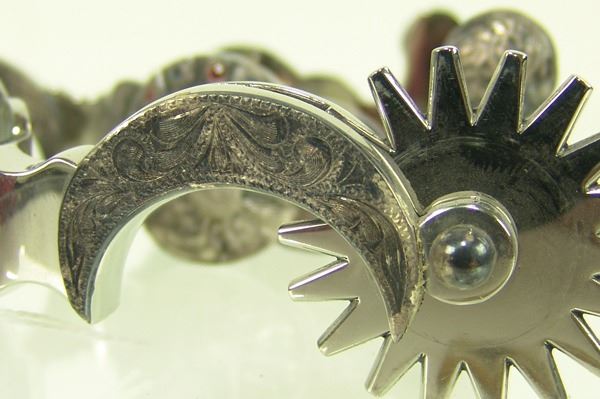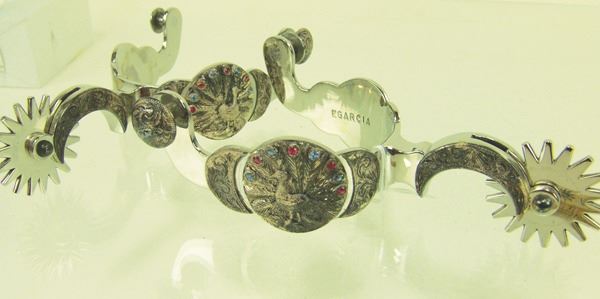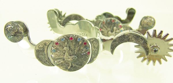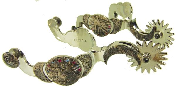 Fancy pair of single mounted parade spurs with famous jeweled peacock conchos, quarter moon shanks, and 1-7/8", 18-point rowels. Very good condition.Mid/Late 1900sAdult