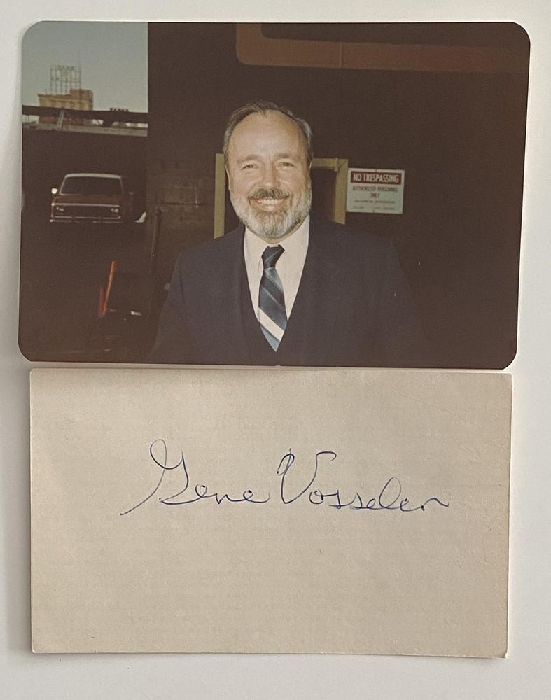 One of a kind E. Gene Vosseler original signature with photo from 1960 The Merv Griffin Show. This item was obtained from an employee of the Merv Griffith show who took pictures of all the stars and had them sign a momemeto 5x3 inches