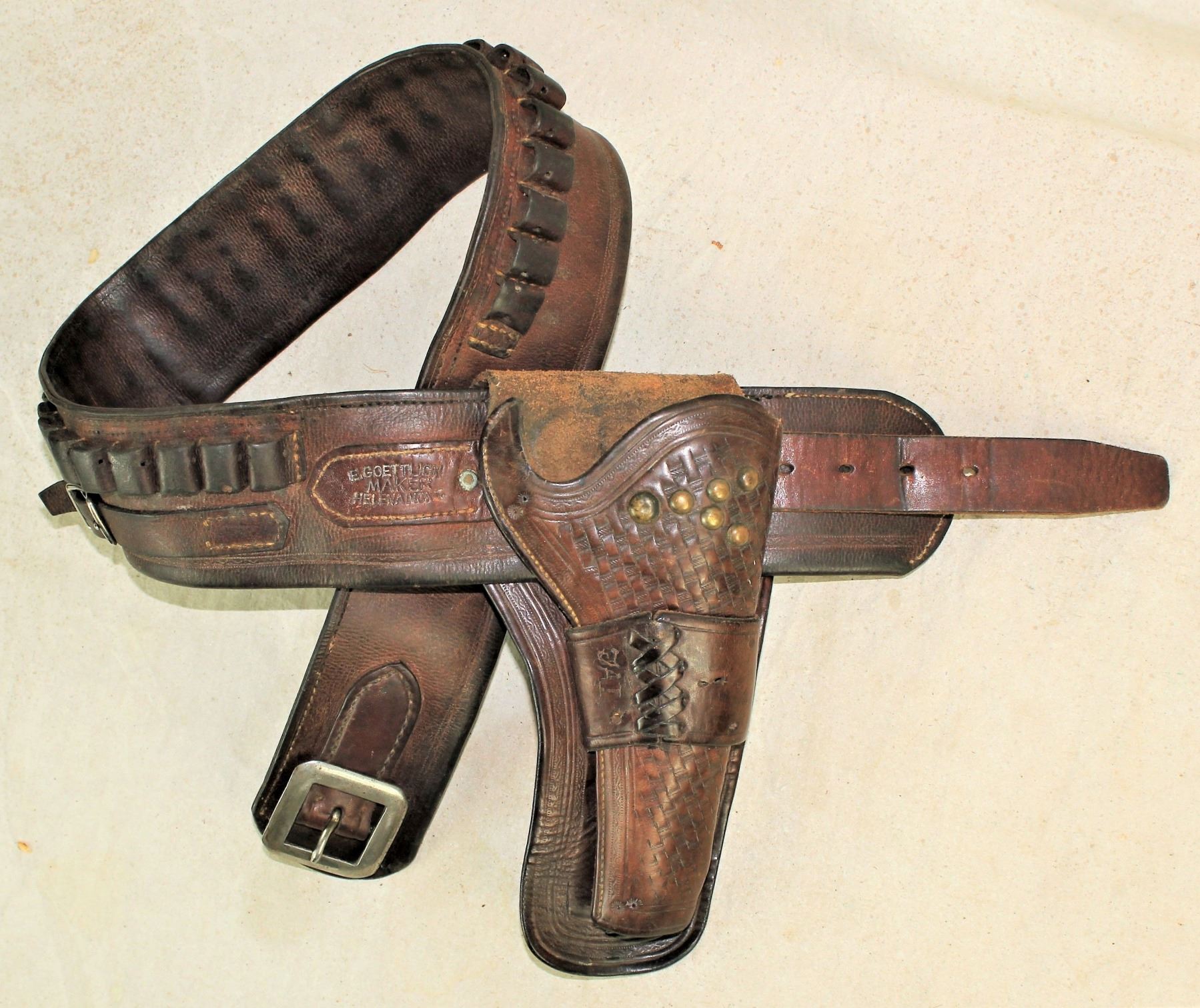 Incredibly rare Montana made holster and money belt, single loop holster with basket stamped tooling fitting a 5 1/2" Colt single action, with an extra wide money belt having 45 caliber loops. In nice condition, with great color.