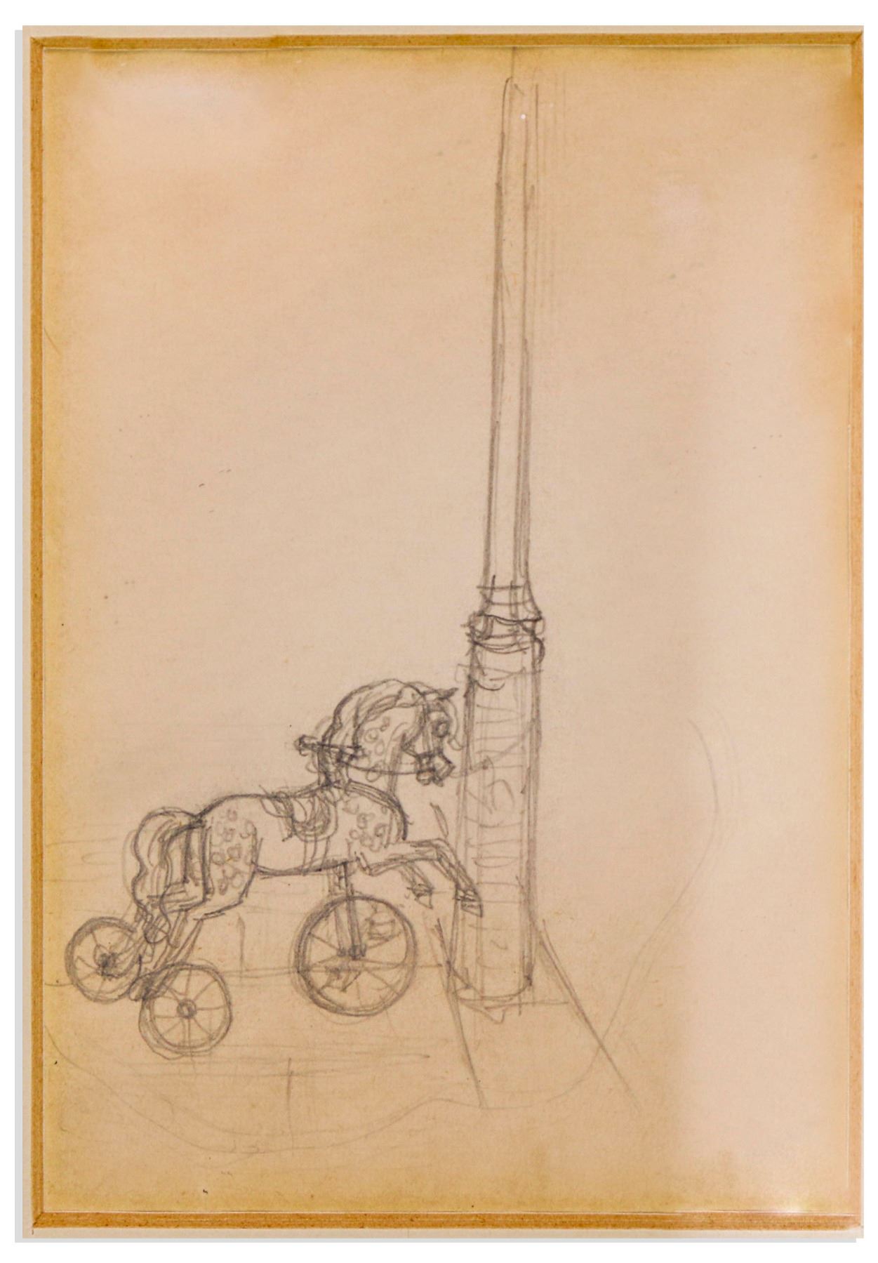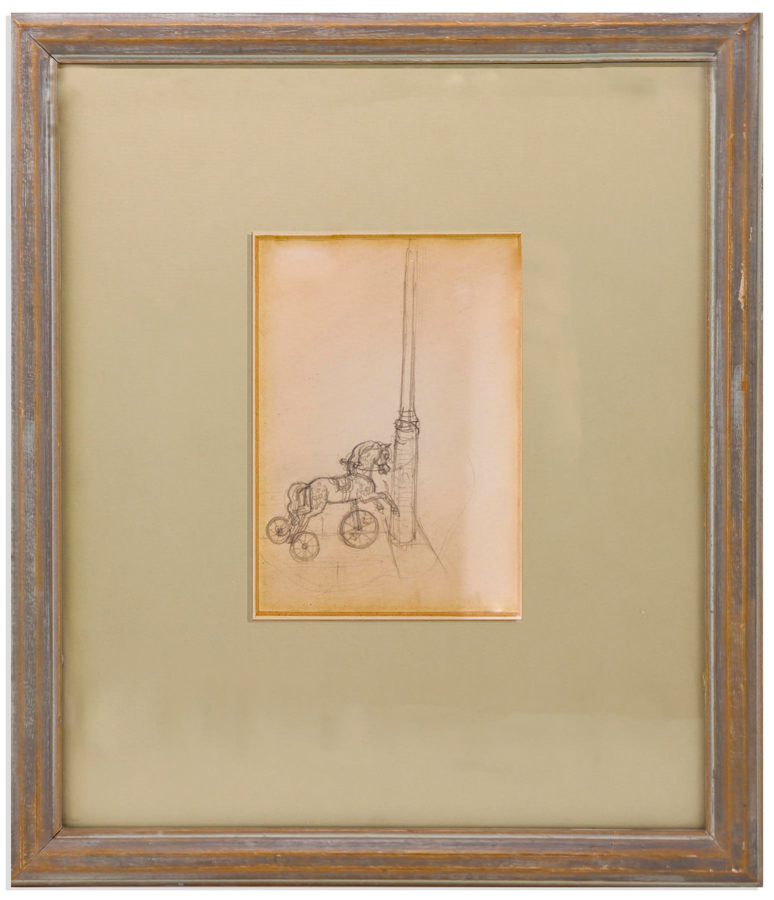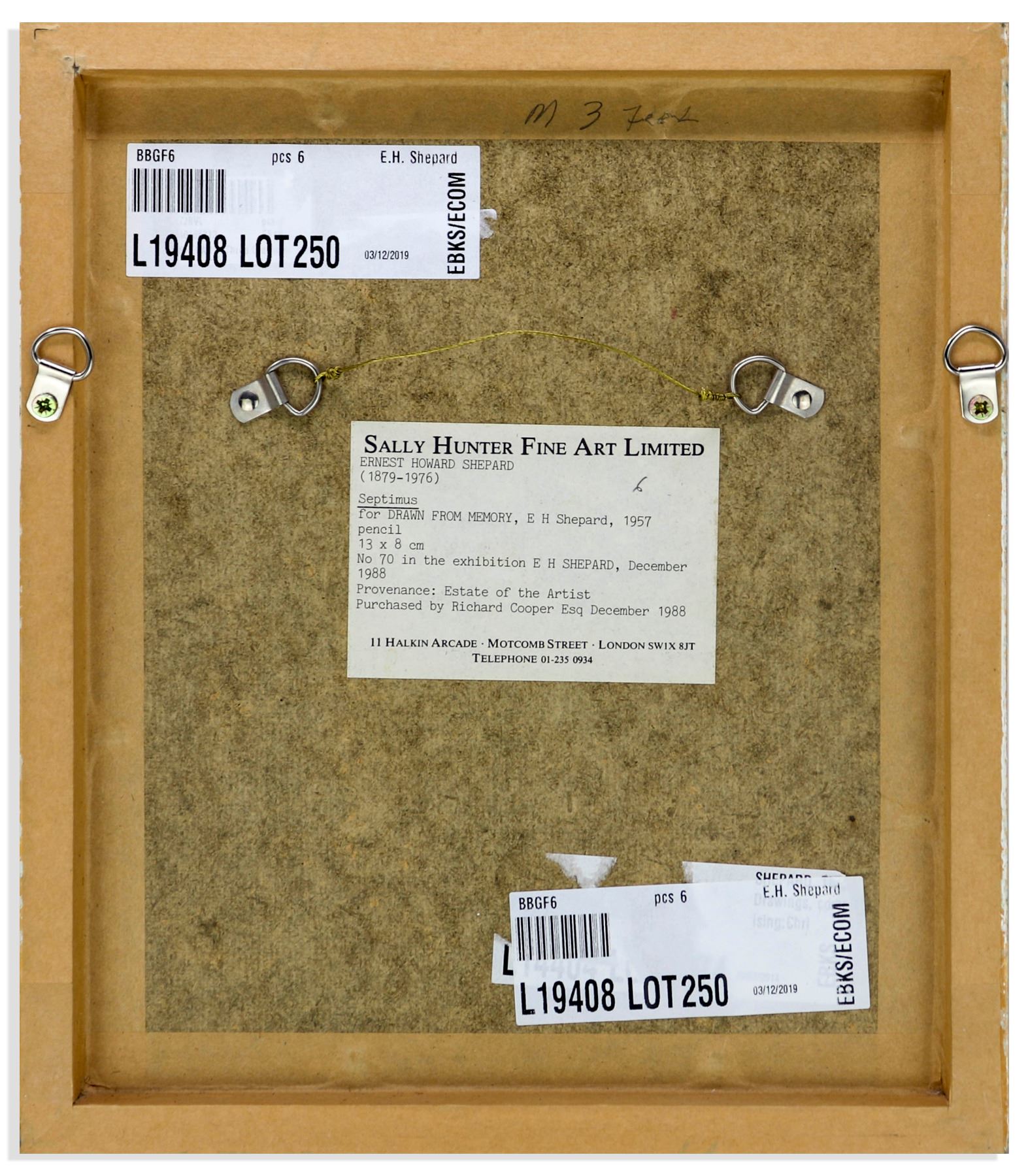 Drawing by Winnie-the-Pooh illustrator E.H. Shepard, titled ''Septimus'', done for ''Drawn from Memory: The Autobiography of E.H. Shepard''. Preliminary pencil drawing measures approximately 4'' x 5.75'', framed to 11'' x 12.75''. With label on back of frame from Sally Hunter Fine Art Limited, who exhibited Shepard's artwork in December 1988 where this was sold. Not examined out of frame, drawing appears lightly toned, in very good to near fine condition.