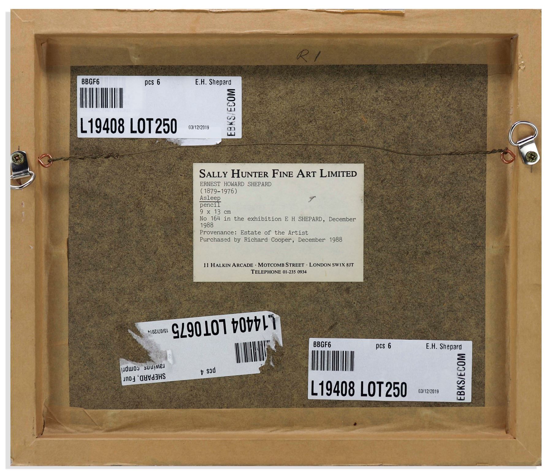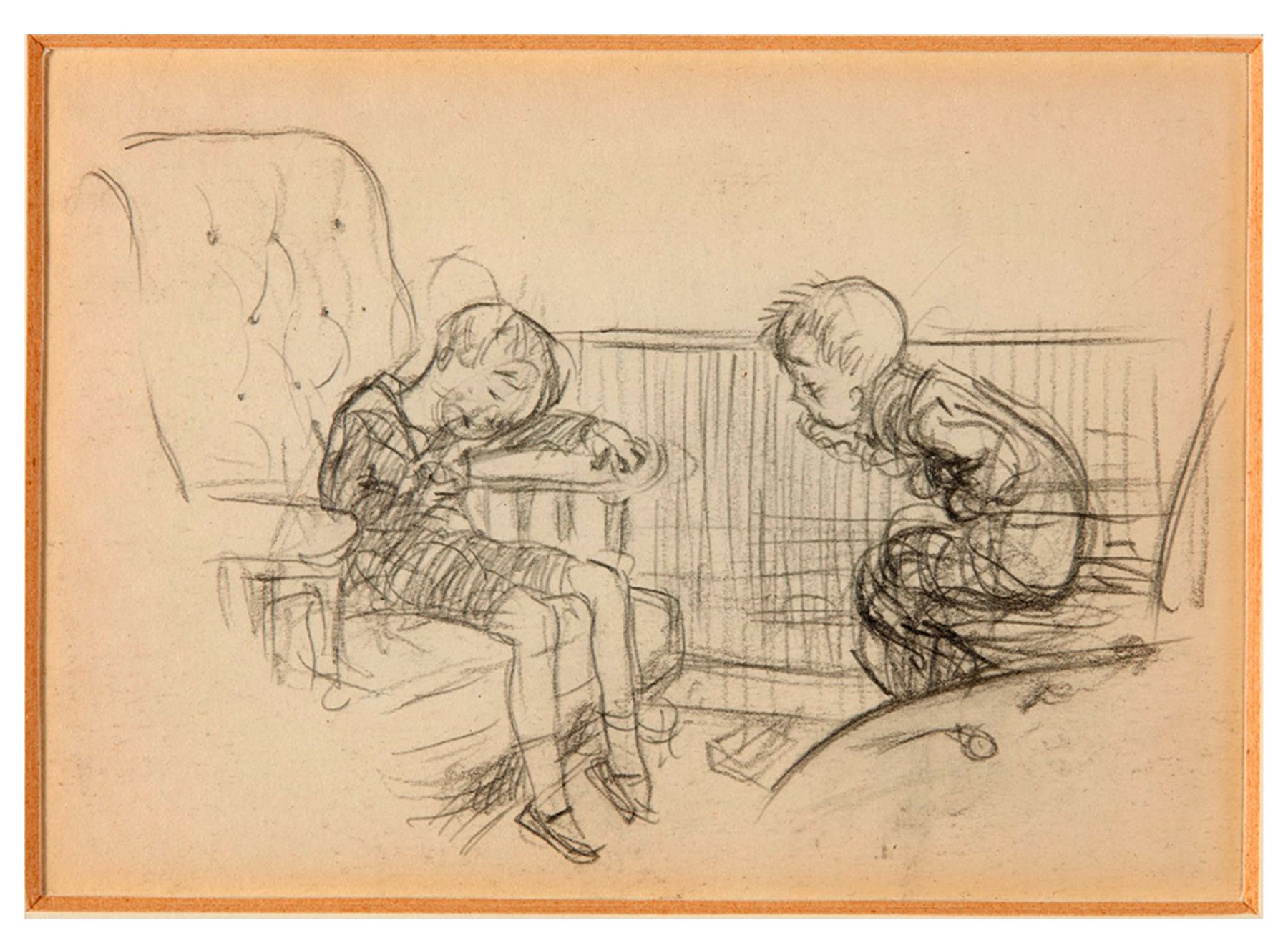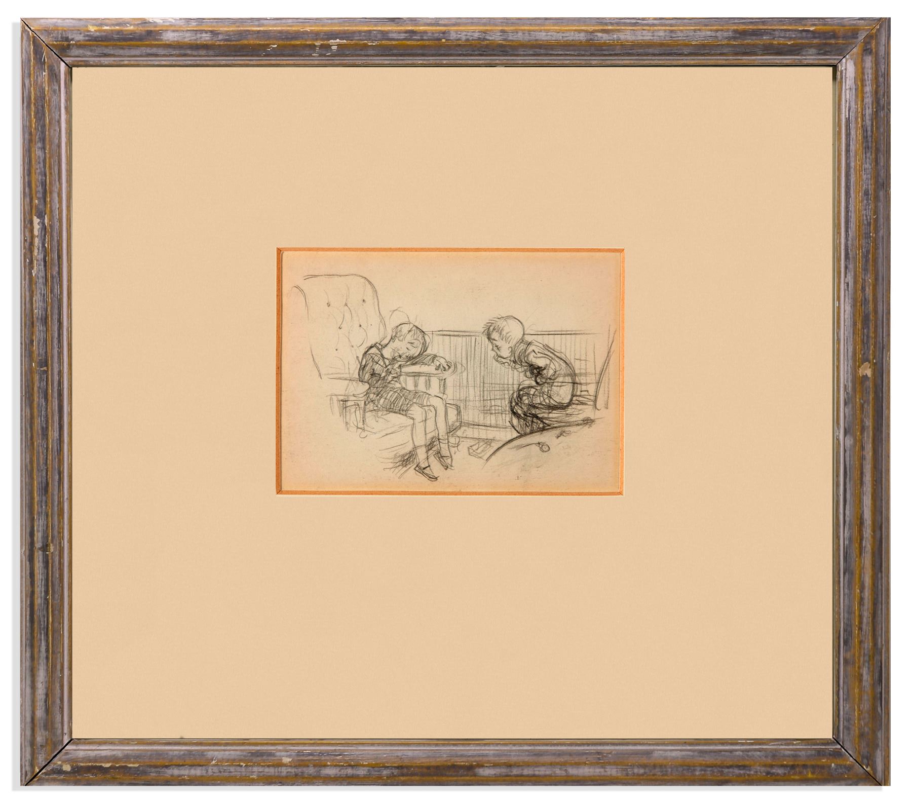Drawing by Winnie-the-Pooh illustrator E.H. Shepard of two children, titled ''Asleep''. Preliminary pencil drawing measuring approximately 5'' x 3.5'' is framed to 12.625'' x 11''. With label on back of frame from Sally Hunter Fine Art Limited, who exhibited Shepard's artwork in December 1988 where this was sold. Not examined out of frame, drawing appears lightly toned, in very good to near fine condition.