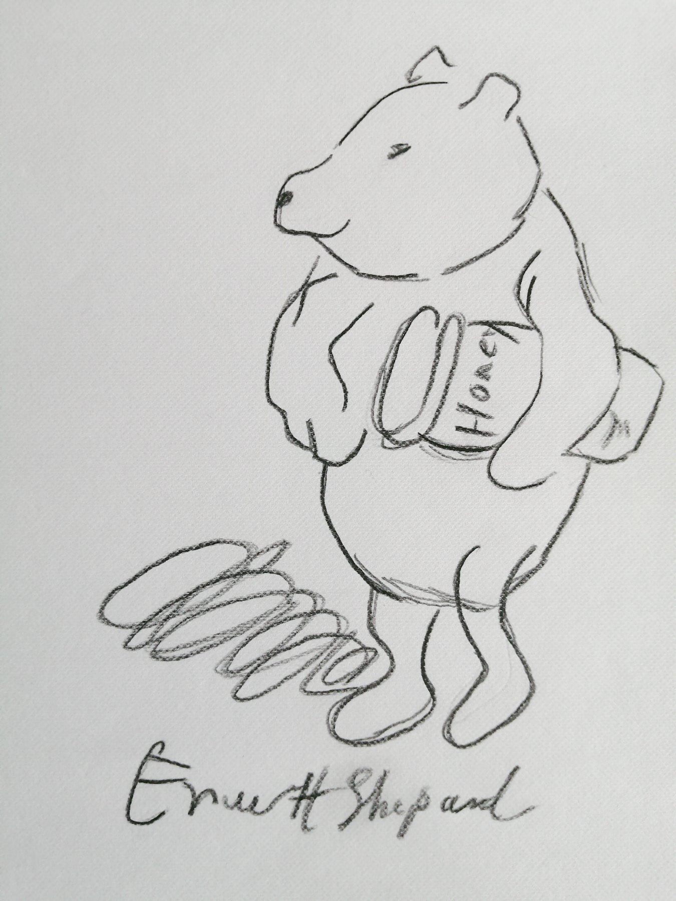 E. H. Shepard drawing of Winnie the Pooh. Size: 7.5x6 inches. Mounted, framed and supplied with coa.