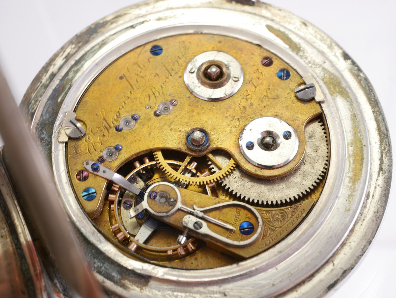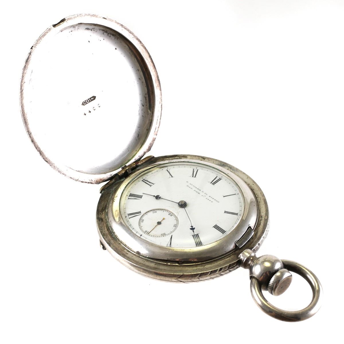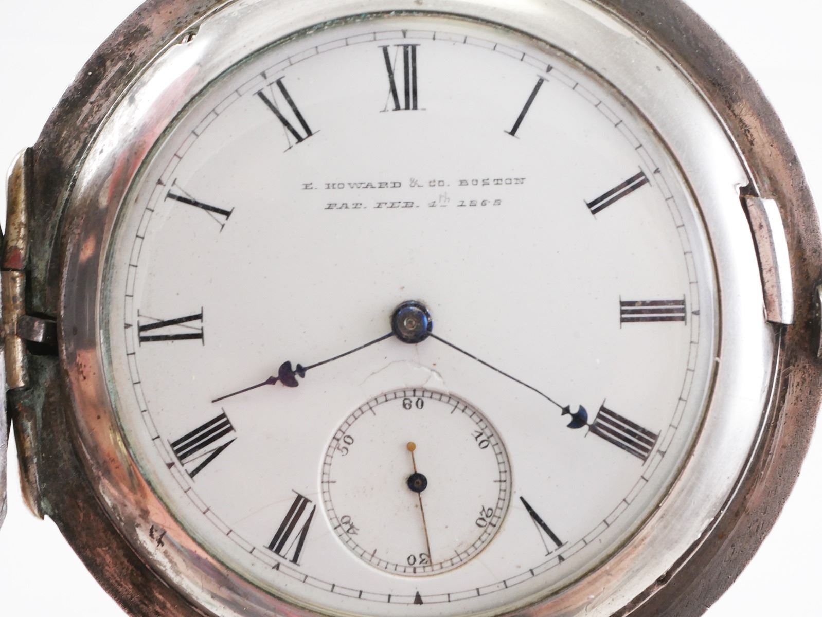 Antique E. Howard circa 1870 coin silver hunter case pocket watch. Model IV. Pocketwatch is size 18s. Key (included) wind. Serial number 35813. Porcelain dial has minor hairline at 7 o'clock and crack below center. Case is marked COIN 4400. Hunter case measures approx. 63mm. Overall weight is 228.4 grams. No monograms. Watch runs but has not been tested for accuracy. Watch has general wear commensurate with age. See photos for more details on condition.