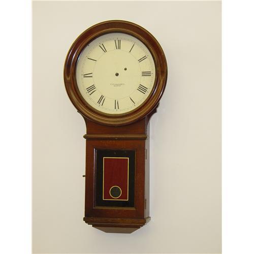 E. HOWARD NO. 70 REGULATOR WALL CLOCK - MAHOGANY CASE W/ ROUND PAINTED METAL FACE, RECTANGULAR DROP, BLACK GOLD & RED REVERSE PAINTED GLASS PANELED DOOR, SIGNED BRASS WORKS W/ PENDULUM & WEIGHT - WEAR, LOSSES, IMPERFECTIONS; EST. 3000-5000