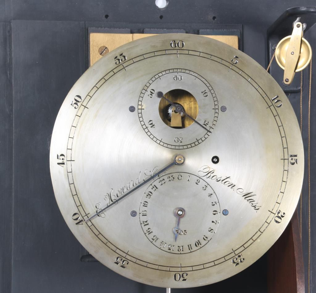 E. Howard No. 74 Astronomical Observatory Regulator. 12 in. silvered bronze Astronomical dial has black incised 5 minute numbers on the chapter ring with sub 24 hour dial and sub seconds dial having an open center, original blued hands, dial is signed E. Howard & Co., Boston, Mass. and numbered 305. Quality brass, weight driven movement has Graham deadbeat escapement with jeweled pallets, Geneva stop & maintaining power, movement signed E. Howard & Co., Boston; has an original silvered, 4 steel jar mercurial cluster pendulum with beat adjustment disc at the bottom, numbered 305 over 3364. Includes a gear in front of the escape wheel which originally would connect to a chronograph within the observatory, the gear would rotate with the escape wheel making 1 full rotation per minute; an electronic circuit between the clock & chronograph would be interrupted once every minute through a missing tooth in the gear allowing precise time to be tracked on the chronographs chart. The case has an iron back, cast in one piece on which the movement bracket and mahogany case front are mounted, has an iron side weight with 2 quality brass pulleys in the right side of the case which is partitioned by a wooden baffle and silvered bronze beat indicator plaque at the point of the pendulum; the electronic chronograph components have been removed from the clock which in in good running condition. 2 mounting screws are replaced on the side of the case. 60 in. high x 18.5 in. wide x 11 in. deep.
