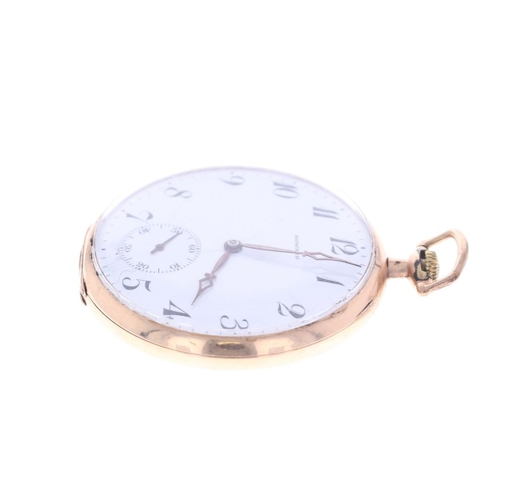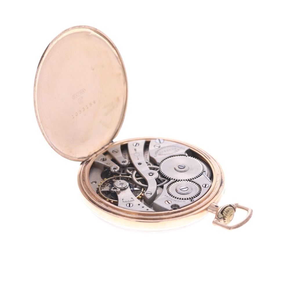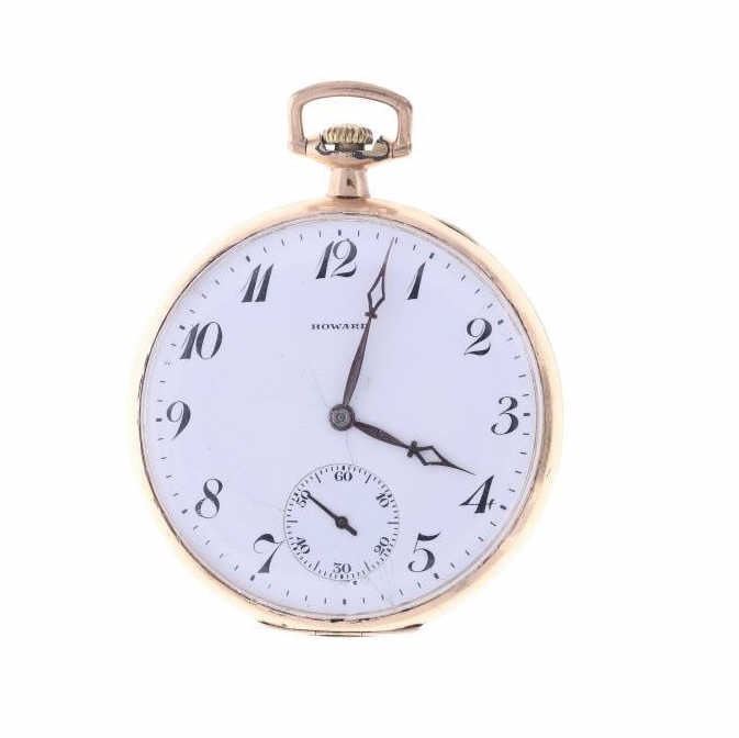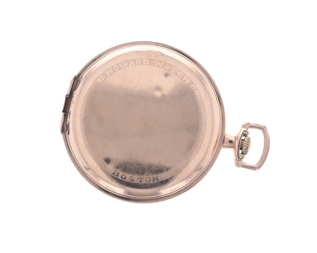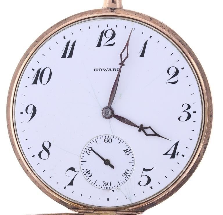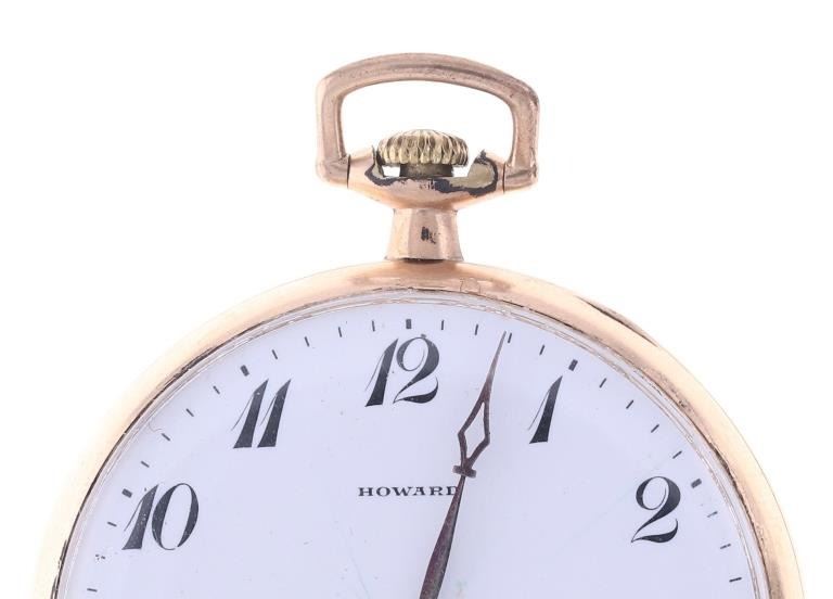 Featured in this lot is this E. Howard Watch Co. 17J pocket watch circa estimated production year 1915. The watch features a wonderfully and professionally crafted brass construction that shows 17 Jewels. The watch face is marked Howard. The back lid to the case is marked as follows: Extra - 1033154. The mechanism is marked as follows: E. Howard Watch Co. - 1295639 - Boston, U.S.A. - 17 Jewels. The condition of this pocket watch is good, the watch winds but isn't igniting the ticker but otherwise shows good overall condition. The measurements of this pocket watch is 2 1/4" x 1 3/4" x 3/8".